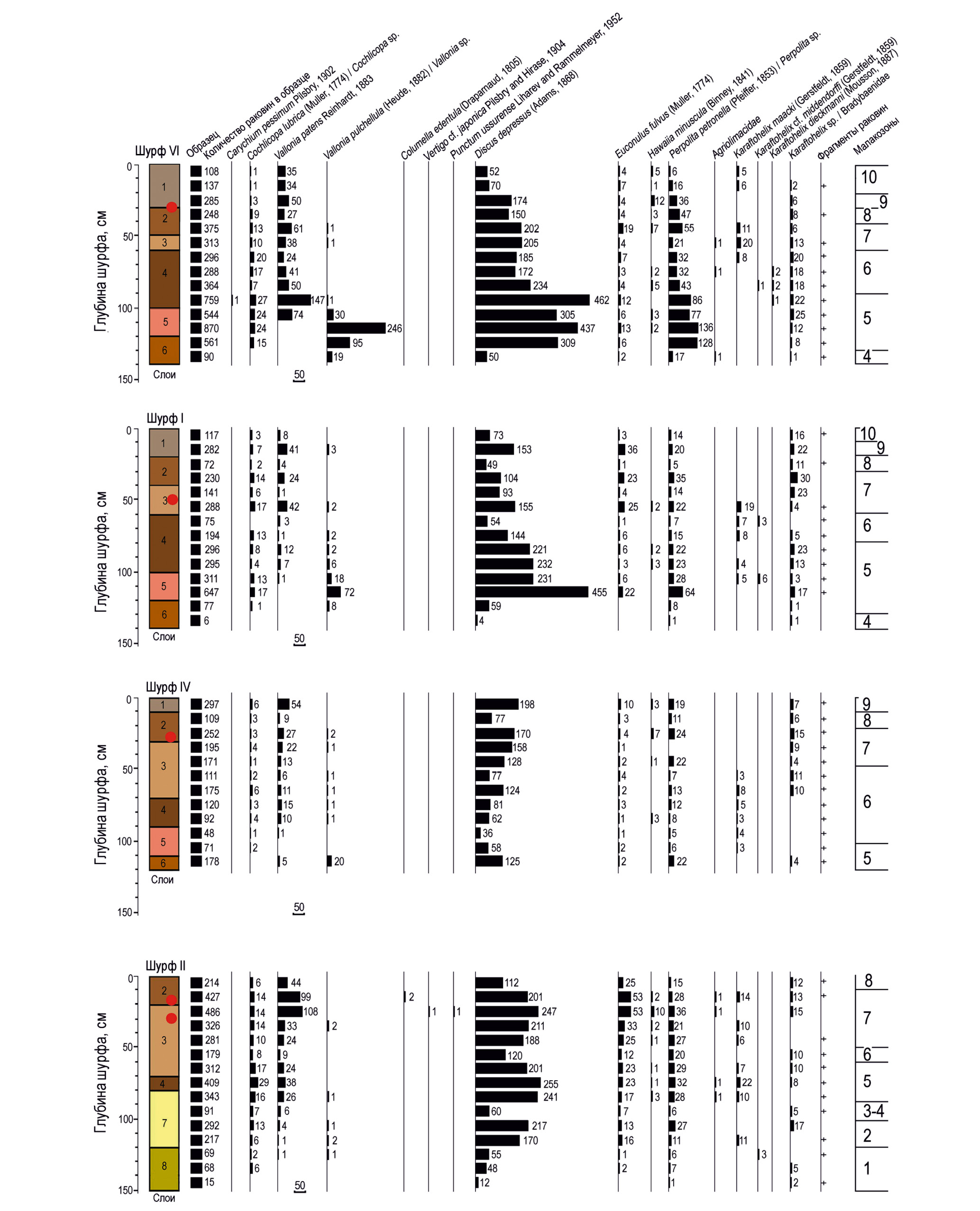 Малакозоны (MZ) | Регистрационный номер образца | Шурф | Слой | Глубина, см | Carychium pessimum Pilsbry 1902 | Cochlicopa lubrica (Müller 1774) / Cochlicopa sp. | Vallonia patens Reinhardt 1883 | Vallonia pulchellula (Heude 1882) | Vallonia sp. | Columella edentula (Draparnau d 1805) | Vertigo cf. japonica Pilsbry and Hirase 1904 | Punctum ussuriense Likharev and Rammelmeyer 1952 | Discus depressus (Adams 1868) | Euconulus fulvus (Müller 1774) | Hawaiia minuscula (Binney 1841) | Perpolita petronella (Pfeiffer 1853) | Perpolita sp. | Agriolimacidae | Karaftohelix maacki (Gerstfeldt 1859) | Karaftohelix cf. middendorffi (Gerstfeldt 1859) | Karaftohelix dieckmanni (Mousson 1887) | Karaftohelix sp. / Bradybaenidae | Фрагменты раковин | Общее количество раковин |