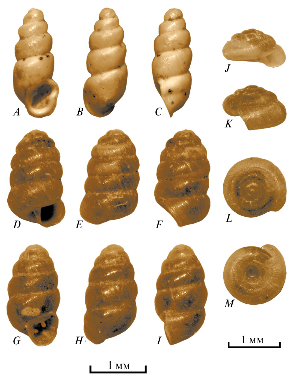 Рис. 4. Виды моллюсков родов Carychium, Columella, Vertigo и Punctum из рыхлых отложений позднего неоплейстоцена и голоцена пещеры Тетюхинская (Приморский край, Россия). A–С–Carychium pessimum, ИГ № 389/6685/1, шурф VI, глубина 0.9–1 м (A – вид со стороны устья, B – вид со стороны, обратной устью, C – вид сбоку); D–F – Columella edentula, ИГ № 389/6632/5, шурф II, глубина 0.1–0.2 м (D – вид со стороны устья, E –вид со стороны, обратной устью, F – вид сбоку); G–I–Vertigo cf. japonica, ИГ № 389/6633/7, шурф II, глубина 0.2–0.3 м (G – вид со стороны устья, H – вид с обратной стороны устью, I – вид сбоку); J–M – Punctum ussuriensis, ИГ № 389/6633/8, шурф II, глубина 0.2–0.3 м (J – вид со стороны устья, K – вид сбоку, L – вид со стороны макушки, M – вид со стороны пупка). ИГ № 389/6685/1 – регистрационный номер образца.