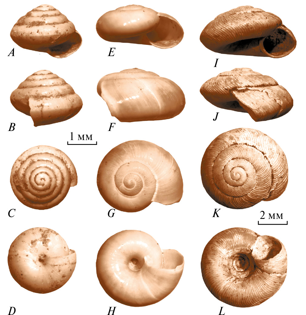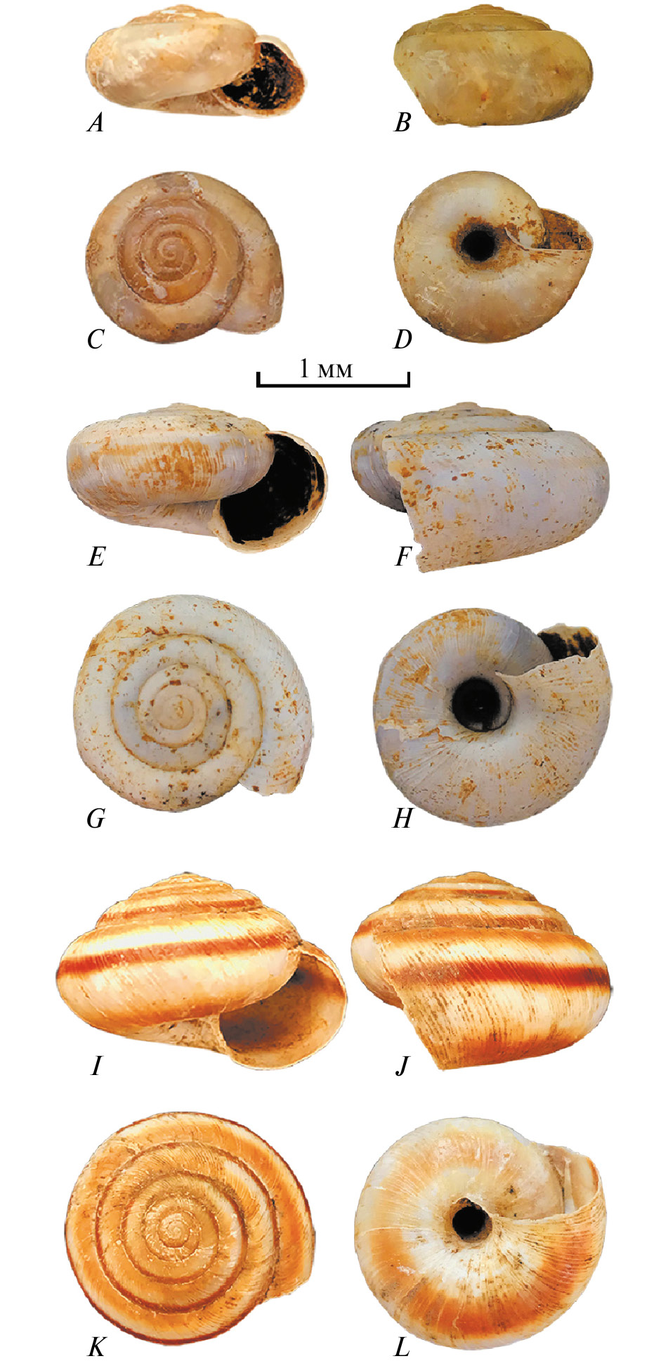 Рис. 7. Виды моллюсков родов Discus, Euconulus и Perpolita из рыхлых отложений позднего неоплейстоцена и голоцена пещеры Тетюхинская (Приморский край, Россия). A–D – Euconulus fulvus, ИГ № 389/6627/11, шурф I, глубина 1.1–1.2 м (A – вид со стороны устья, B – вид сбоку, C – вид со стороны макушки, D – вид со стороны пупка); E–H – Perpolita petronella, ИГ № 389/6628/12, шурф I, глубина 1.2–1.3 м (E – вид со стороны устья, F – вид сбоку, G – вид со стороны макушки, H – вид со стороны пупка); I–L – Discus depressus, ИГ № 389/6664/9, шурф IV, глубина 0.9–1 м (I – вид со стороны устья, J – вид сбоку, K – вид со стороны макушки, L – вид со стороны пупка). ИГ № 389/6627/11– регистрационный номер образца.