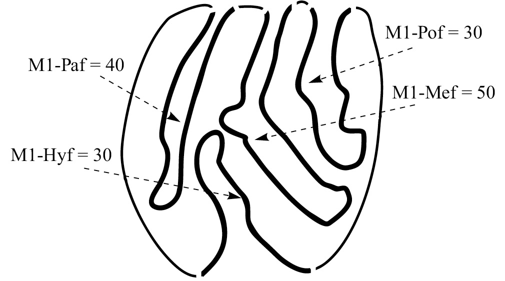 Figure 2. Recognition and nomenclature of the upper dental crown elements in Castor. The analyzed crown elements (flexi) are marked with bold contour lines, with the gaps marking their boundaries. Element designations: Hyf – hypoflexus, Mef – metaflexus, Paf – paraflexus, Pof – posteroflexus. In each designation, the first part refers to a particular tooth (here M1), figure indicates the number of semilandmarks for respective contour lines.