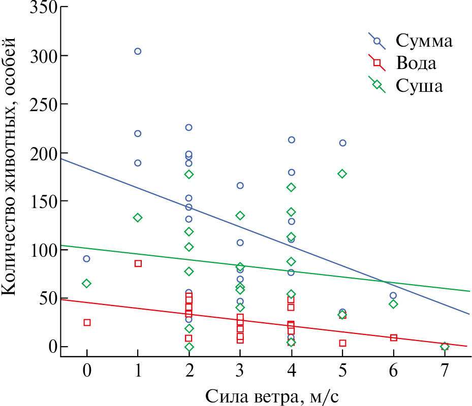 В 2021 г. с увеличением силы ветра суммарное количество нерп, а также количество нерп в воде снижалось (коэффициент корреляции Спирмена для всех нерп R = –0.39, p < 0.05, для нерп в воде R = –0.35, p < 0.05) (рис. 5). На количество нерп на суше сила ветра не оказывала влияния (коэффициент корреляции Спирмена R = –0.14, p > 0.05) (рис. 5). В 2020 г. зависимость количества нерп от силы ветра не была обнаружена (коэффициент корреляции Спирмена для всех нерп R = –0.22, p > 0.05, для нерп на суше R = –0.24, p > 0.05, для нерп в воде R = –0.33, p > 0.05).