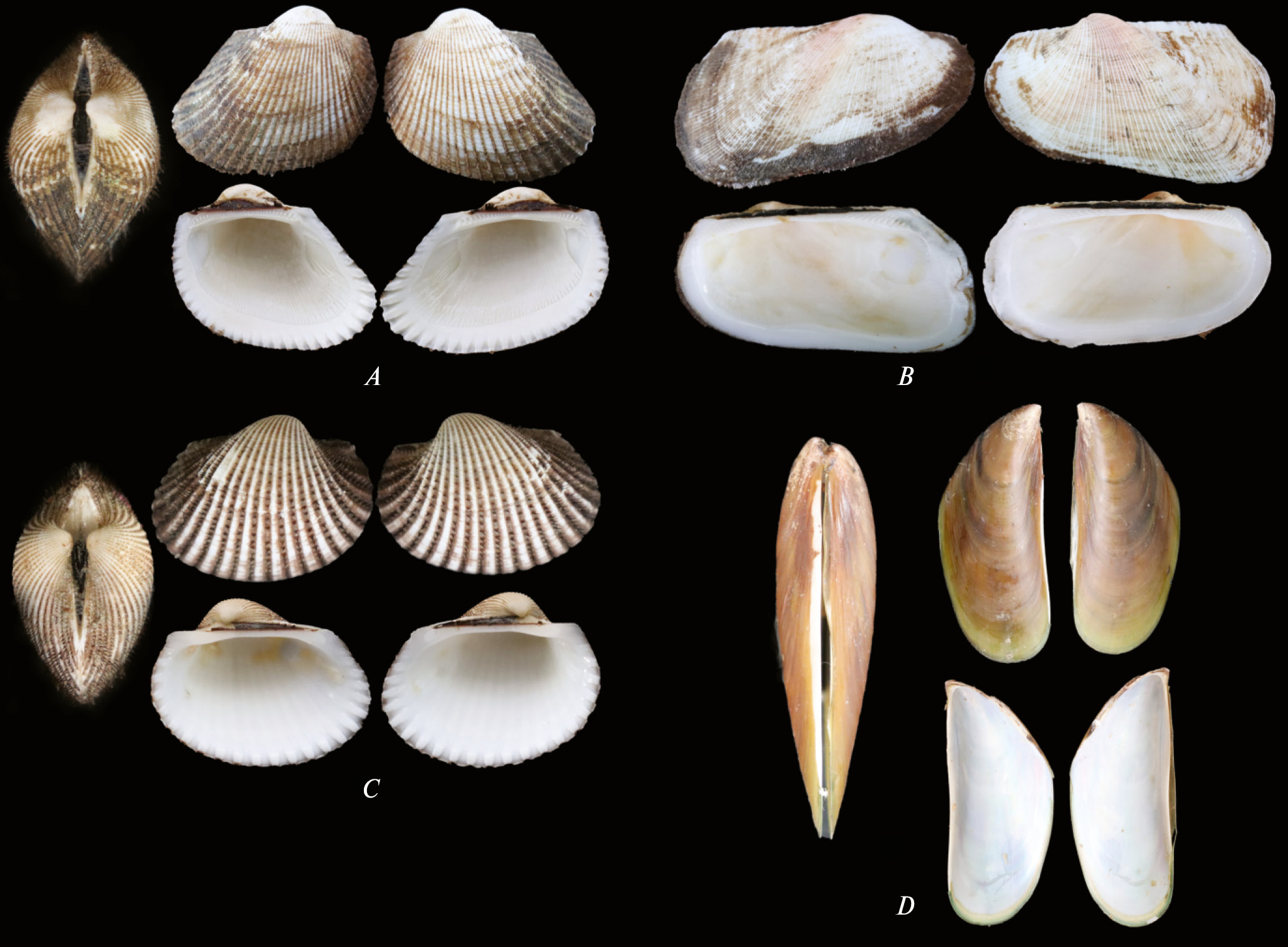 Fig. 2. A – Solen vagina (93 mm), B – Asaphis violascens (49 mm), C – Vasticardium pectiniforme (32 mm), D – Lutraria rhynchaena (64 mm)