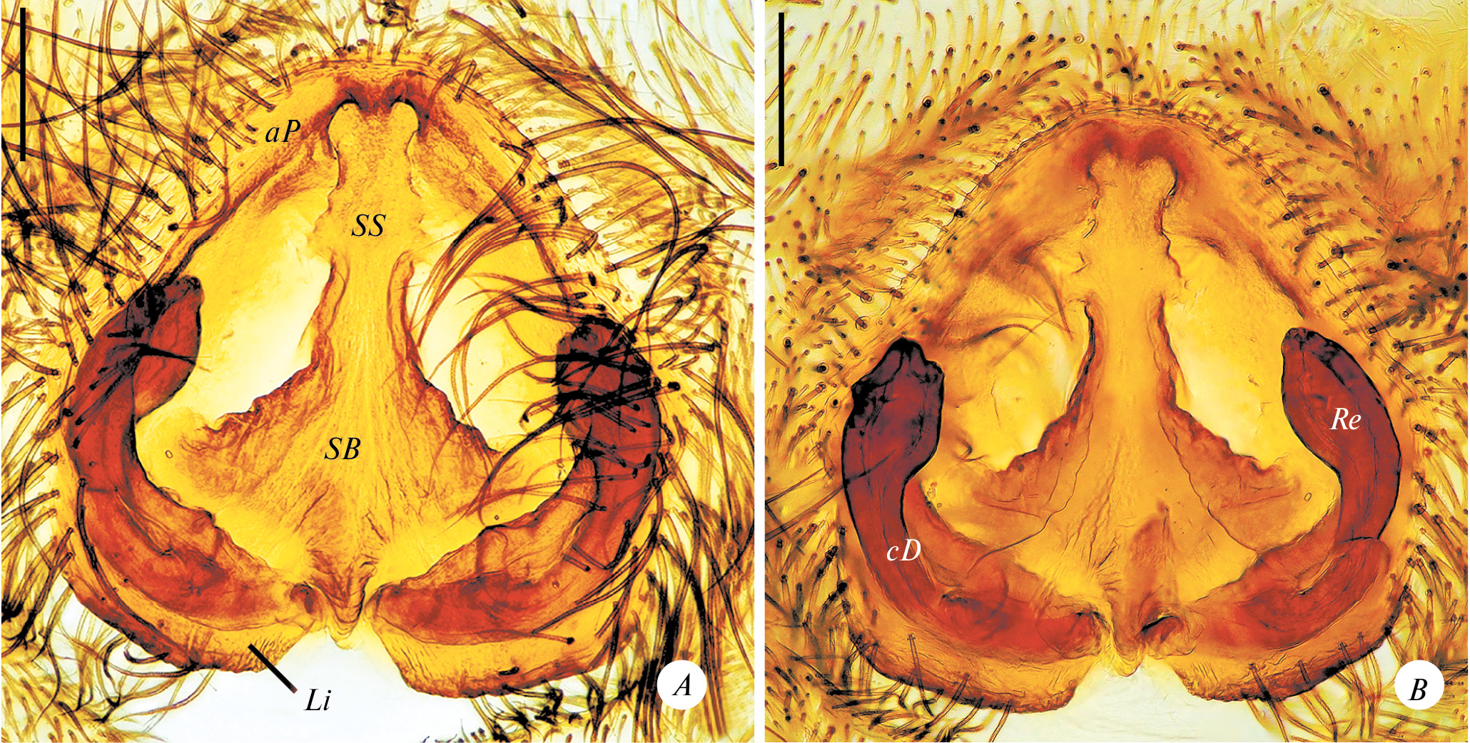 Epigyne as in Figs 1A, 1B and 2: fovea triangle, its anterior part shorter than posterior one; apical pockets (aP) closely spaced; septum widened posteriorly, forming diamond-shaped base (SB); lips (Li) almost touching each other; receptacles (Re) well distinguishable from copulatory ducts (cD), not converging, head of receptacles spaced under edges of fovea.