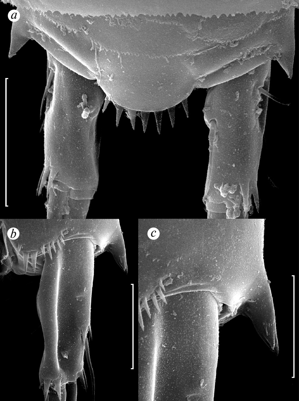 Рис. 3. Canthocamptus (Canthocamptus) microstaphylinus Wolf 1905, СЭМ-фотографии самцов из оз. Байкал: a – анальный сомит и каудальные ветви, дорсально; b – каудальная ветвь, вентрально; c – задненаружный край анального сомита, вентрально. Масштаб, мкм: a – 40, b – 30, c – 20