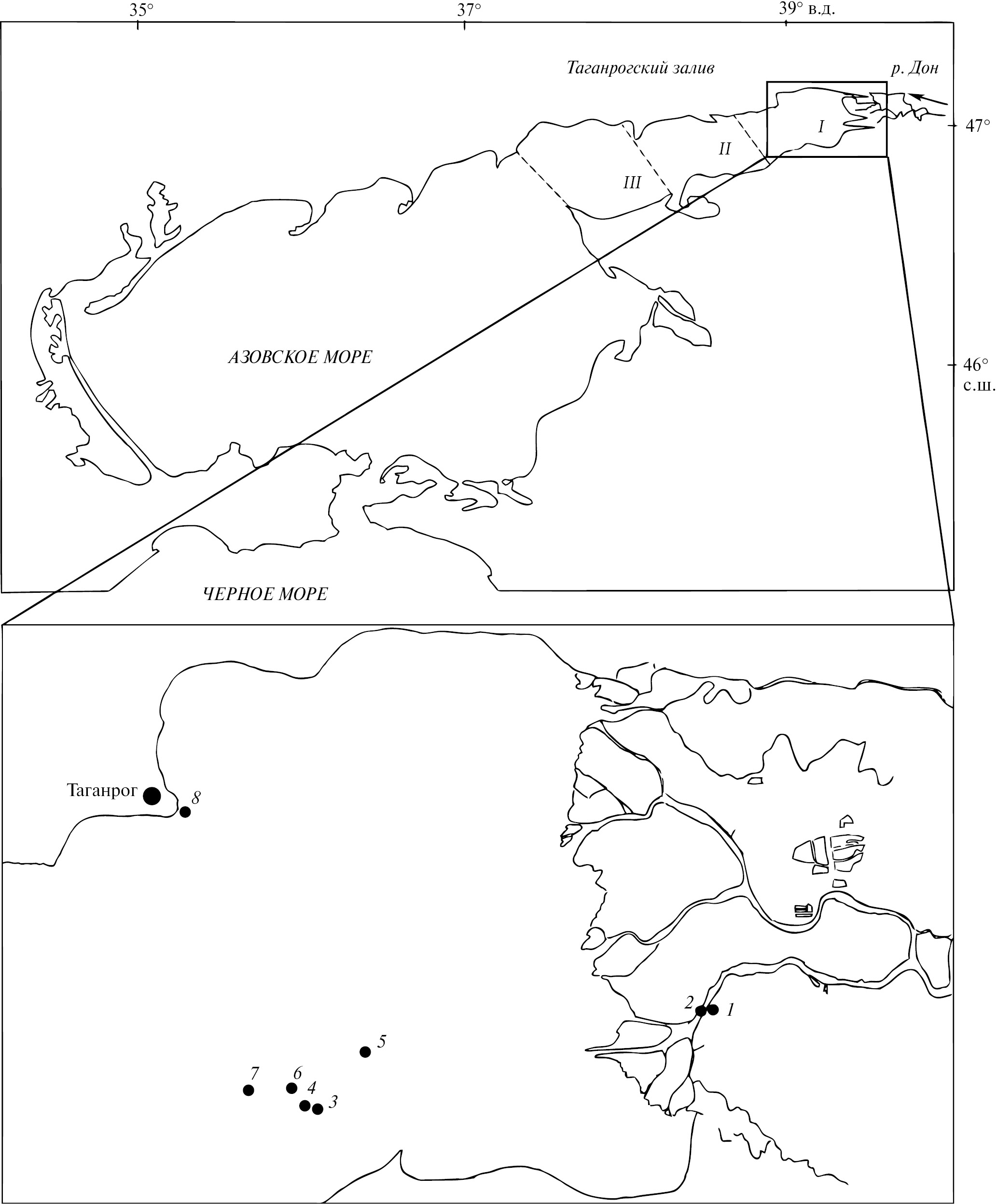 Азовское море – небольшое (акватория 39 000 км2) и неглубокое внутреннее море России (максимальная глубина 13.5 м, средняя 7.4 м), через Черное и Средиземное моря связанное с Атлантическим океаном. Самым крупным заливом Азовского моря является Таганрогский залив (5300 км2). Он расположен в северо-восточной части моря и принимает сток рек Дон и Кубань, которые обеспечивают 95% притока пресных вод в Азовское море (Гидрометеорология …, 1991). По рельефу дна и гидрологическим характеристикам Таганрогский залив разделяют на три района: западный, центральный и восточный (Поважный, 2009; Селифонова, 2010, 2013). Глубины в заливе варьируют в пределах 1–9 м при среднем значении 4.9 м. Соленость максимальна в западном районе залива (до 14.5‰) и минимальна в восточном (до 11‰), примыкающем к дельте р. Дон (Матишов и др., 2015, 2017; Афанасьев и др., 2019).