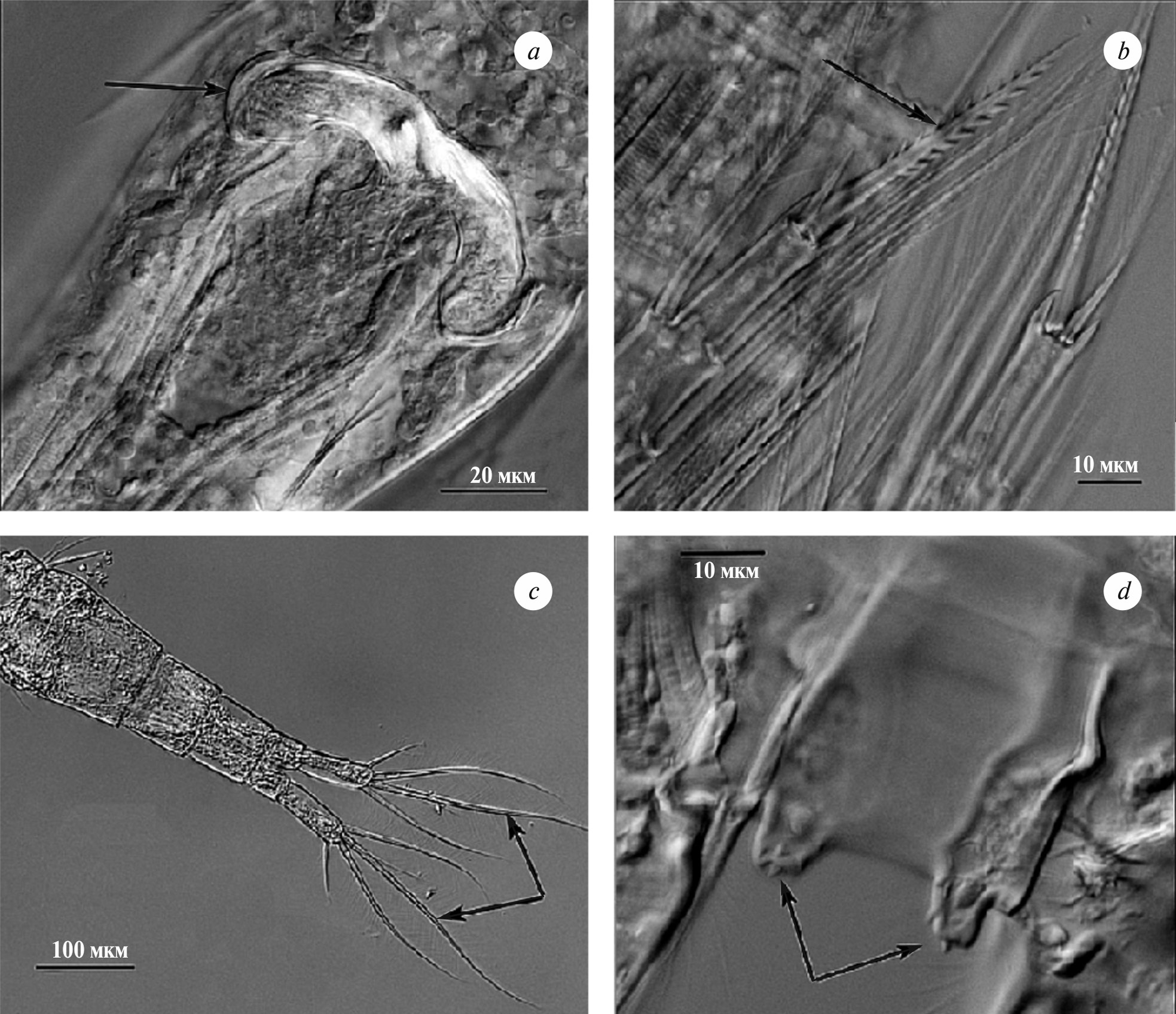 Рис. 2. Важные для идентификации качественные признаки самок Thermocyclops taihokuensis: a – семяприемник, b – внутренний шип дистального членика эндоподита Р4, c – форма апикальных щетинок, d – вооружение выступов интеркоксальной пластинки Р4