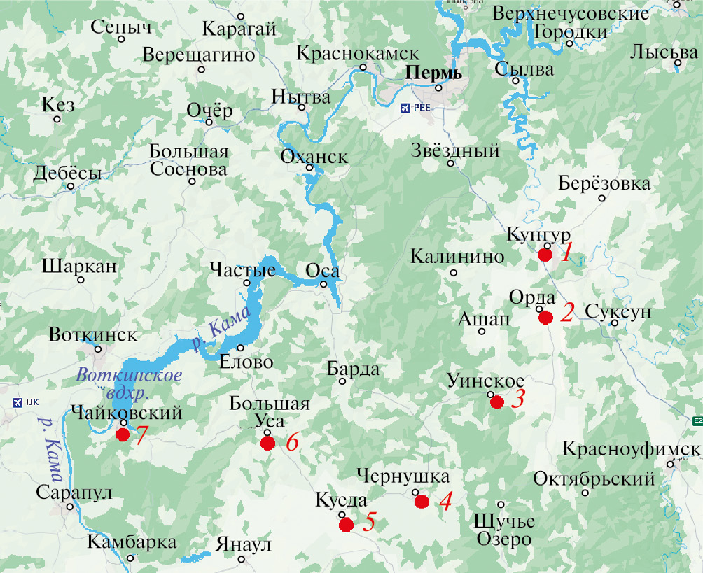 Рис. 2. Пункты маршрутного исследования комплекса паразитоидов липовой моли-пестрянки (Ph. isskii) в Пермском крае: 1 – г. Кунгур, 2 – с. Орда, 3 – с. Уинское, 4 – г. Чернушка, 5 – п. Куеда, 6 – с. Большая Уса, 7 – г. Чайковский