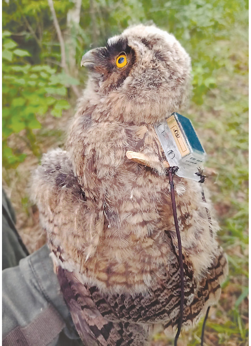 Рис. 1. Птенец ушастой совы по кличке “Пухляш” в процессе надевания на него GPS-GSM трансмиттера. Именно от этого птенца получены данные через год