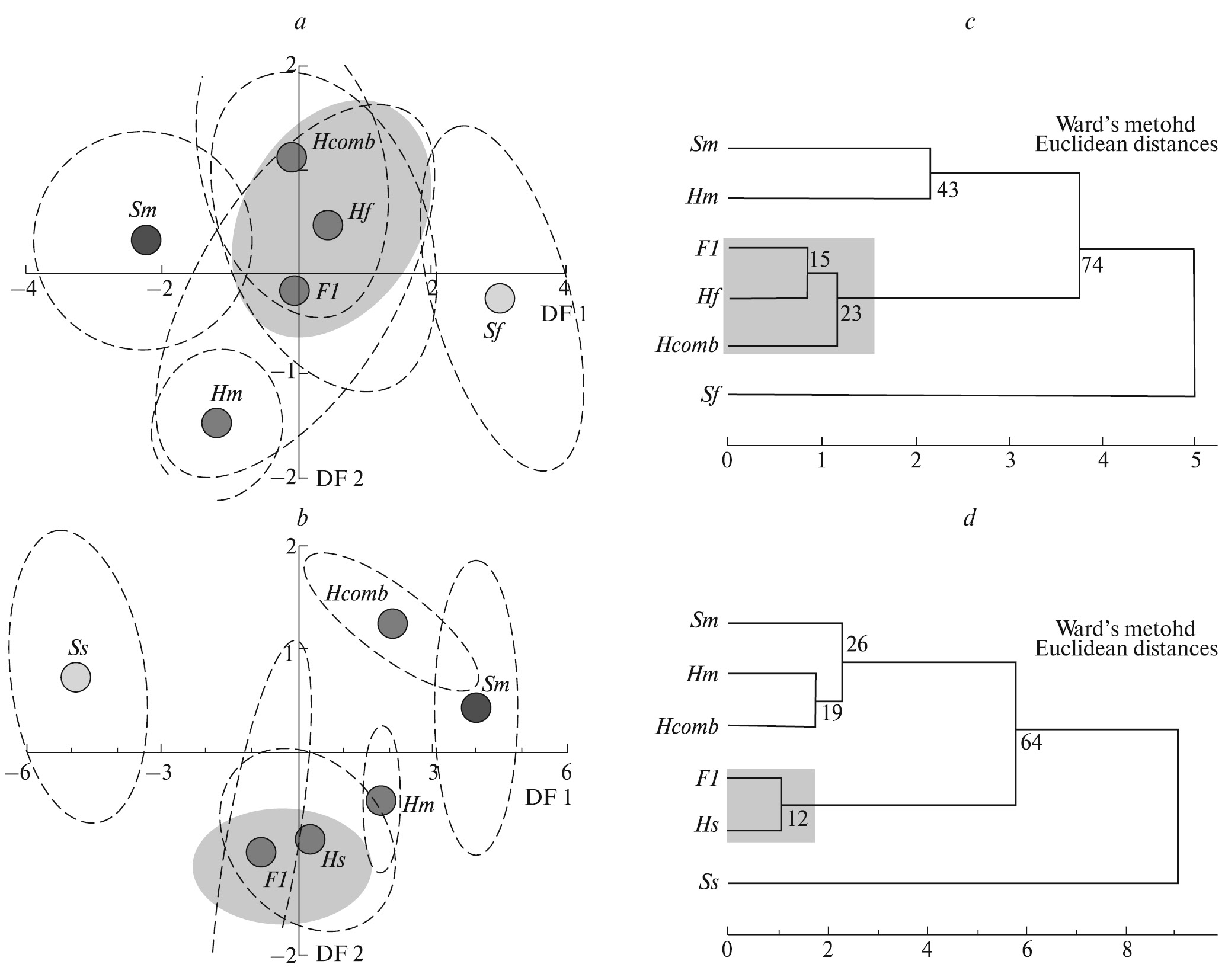 Рис. 7. Результаты пошагового дискриминантного и кластерного (по средним каноническим переменным, метод Варда) анализов размерных, окрасочных и биоакустических признаков выборок гибридов и особей родительских видов из гибридной зоны большого и желтого сусликов (a, c) и зоны симпатрии большого и крапчатого сусликов (b, d). Пунктиром показаны эллипсы рассеивания (95% вероятности), показателей признаков в пространстве дискриминантных функций. Обозначения те же, что и на рис. 1. Пояснения в тексте