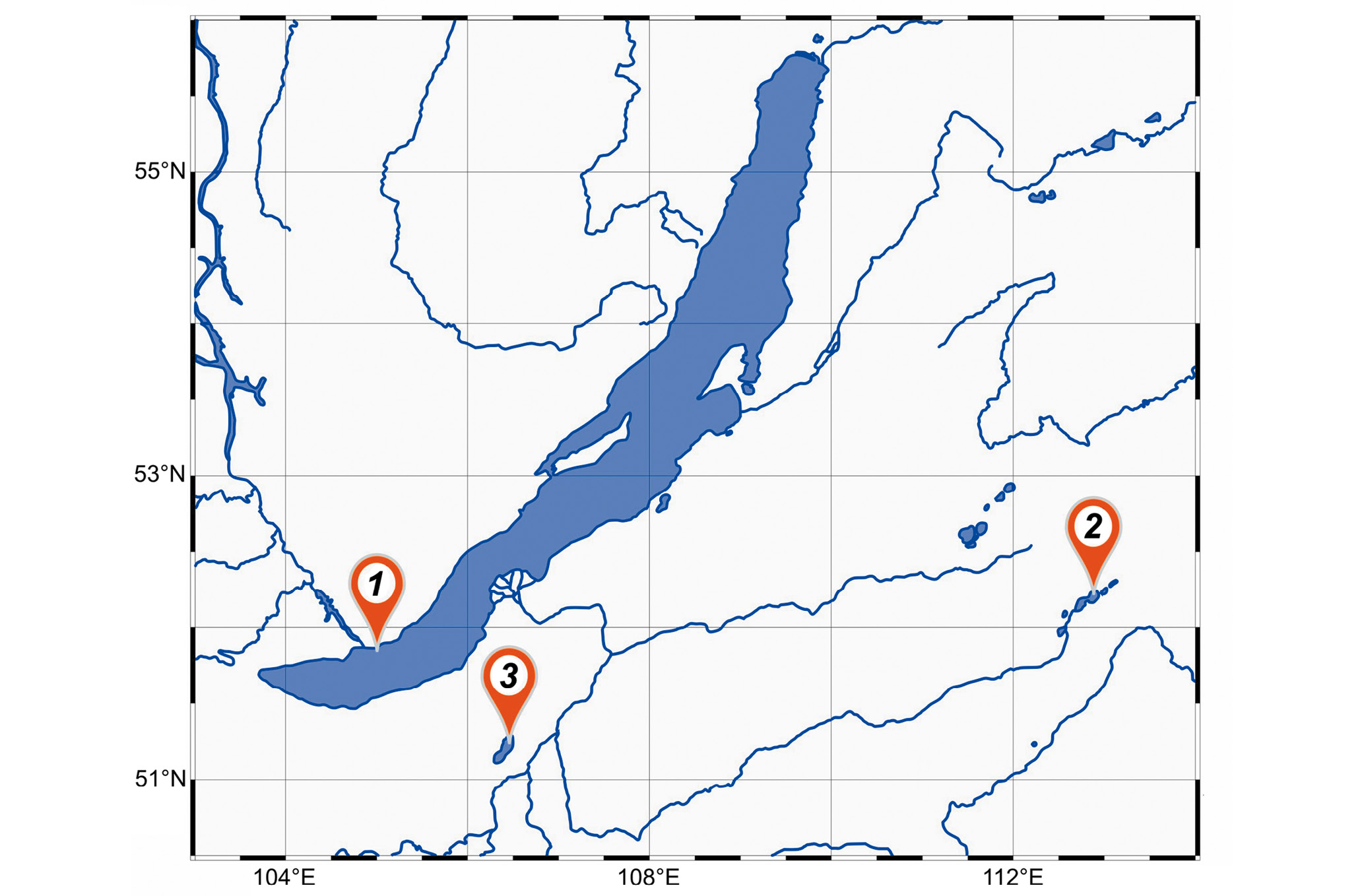 Рис. 1. Карта с обозначением мест поимки песчаной широколобки в озерах: 1 – Байкал, 2 – Арахлей, 3 – Гусиное.