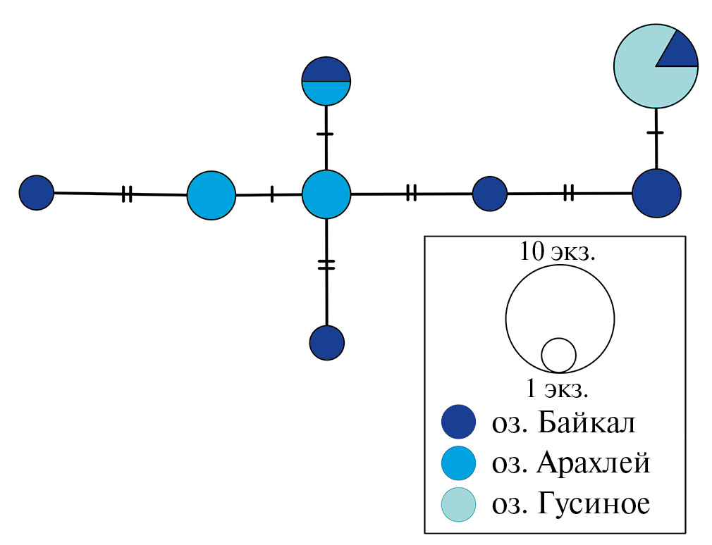 Рис. 5. Сеть гаплотипов контрольного региона (CR) мтДНК для L. kesslerii из озер Байкал, Арахлей и Гусиное.
