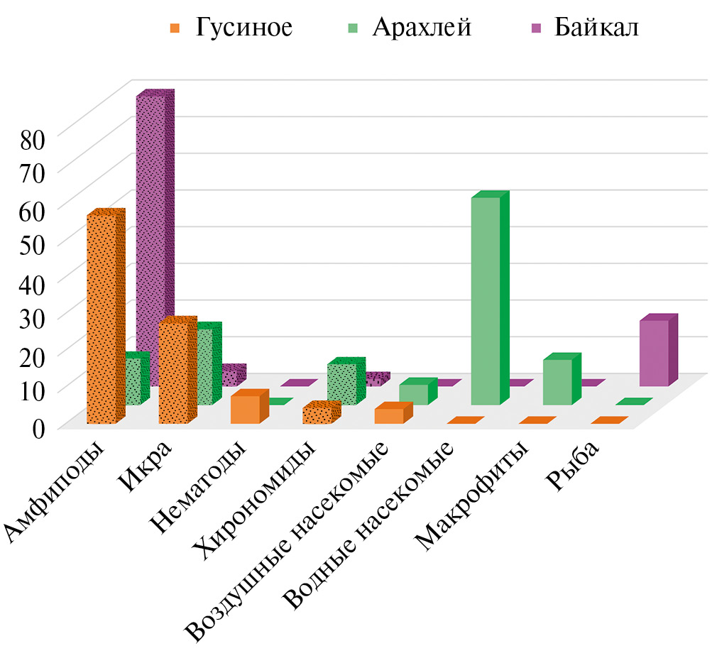 Все изученные формы песчаной широколобки занимают в озерах сходные экологические ниши. Спектр питания песчаной широколобки широк по составу потребляемых кормовых организмов и динамичен по их соотношению. Однако в пищевом комке превалируют обычно 2–3 группы гидробиоионтов, остальные встречаются редко. К одинаковым для всех форм песчаной широколобки пищевым объектам в летний сезон относятся амфиподы, хирономиды и оплодотворенная икра собственного вида (рис. 8). Расхождения в спектрах питания песчаной широколобки обусловлены особенностями зообентосных сообществ разных озер (Попков и др., 2008). Летом в зообентосе оз. Арахлей доминировали личинки водных насекомых, что прослеживалось в их превалировании в диете арахлейской широколобки. В зообентосе оз. Байкал супердоминантами являлись амфиподы и олигохеты. При этом амфиподы всегда преобладали в пище байкальской песчаной широколобки, а олигохеты в пищевом комке отсутствовали или встречались единично (Базикалова, Вилисова, 1959; Толмачева, 2013). Помимо донных беспозвоночных, в рацион взрослых особей байкальской песчаной широколобки входила молодь других видов коттоидных рыб (Толмачева, 2008). Поскольку в фауне озер Арахлей и Гусиное, помимо песчаной широколобки, других видов Cottoidei нет, в диетах арахлейской и гусиноозерской форм рыба отсутствовала.
