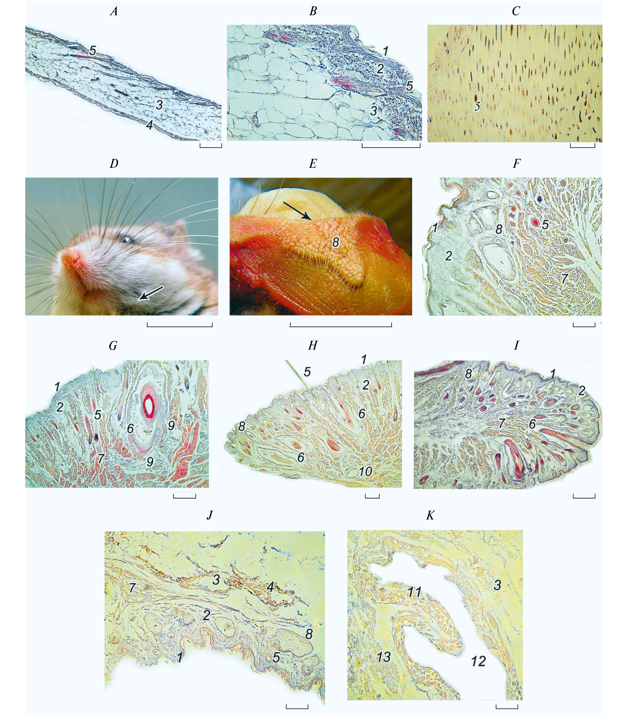 Вибриссная подушка. Микроструктура мистациальной кожи (рис. 4D) отличается от таковой на туловище как по метрическим параметрам, так и по степени развития структур. Здесь кожа сильно утолщена (1169.0 ± 28.1 мкм), в основном за счет сетчатого слоя. В этом слое присутствуют многочисленные крупные (толщиной до 102 мкм) пучки поперечнополосатой мускулатуры, которые ориентированы перпендикулярно поверхности кожи (рис. 4G, 4, 7). Роговой слой толстый (до 26 мкм), рыхлый и сильно отслаивается. Эпидермис без него тонкий (не более 12 мкм) и не образует сосочков. Подкожная клетчатка почти не содержит жировых клеток. В коже эти клетки встречаются только в виде небольших кластеров и находятся глубже луковиц волос и вибрисс. Размеры жировых клеток не более 33.9 × 42.1 мкм. Кожа обильно иннервирована, в ее нижних отделах располагаются многочисленные пучки нервных волокон, толщина которых изменяется от 36.4 до 53.5 мкм. Кожа васкуляризована, присутствуют многочисленные сосуды, диаметр артериол достигает 57 мкм. Слой подкожной мускулатуры довольно тонкий (29.7– 39.5 мкм). Фолликулы волос крупные (27.2– 41.1 мкм), снабжены крупными (86.3 × 22.4, 93.3 × 26.1 мкм) однодольчатыми сальными железами, которые, разрастаясь, полностью окружают волосяной фолликул. Фолликулы вибрисс очень крупные, на поперечных срезах кожи они имеют размеры 477.0 × 907.2, 824 × 418.7 мкм), снабжены толстой соединительнотканной капсулой (рис. 4G). Причем толщина капсулы неравномерная, изменяется от 27.0 до 116.0 мкм. В основании вибриссной сумки в нее проникает мощный (толщиной до 50.9 мкм) пучок нервных волокон, который делает характерный изгиб перед вхождением в фолликул. Поперечнополосатая мышца вибриссной сумки толстая (до 63 мкм), разветвляется на несколько пучков, которые охватывают нижнюю часть фолликула. Кавернозный синус хорошо развит (толщиной до 81 мкм), имеет типичное сетчатое строение. Сальные железы некрупные (72.6 × 30.2; 70.7 × 35.3 мкм), лежат по две в верхней части фолликула, но почти окружают фолликул.