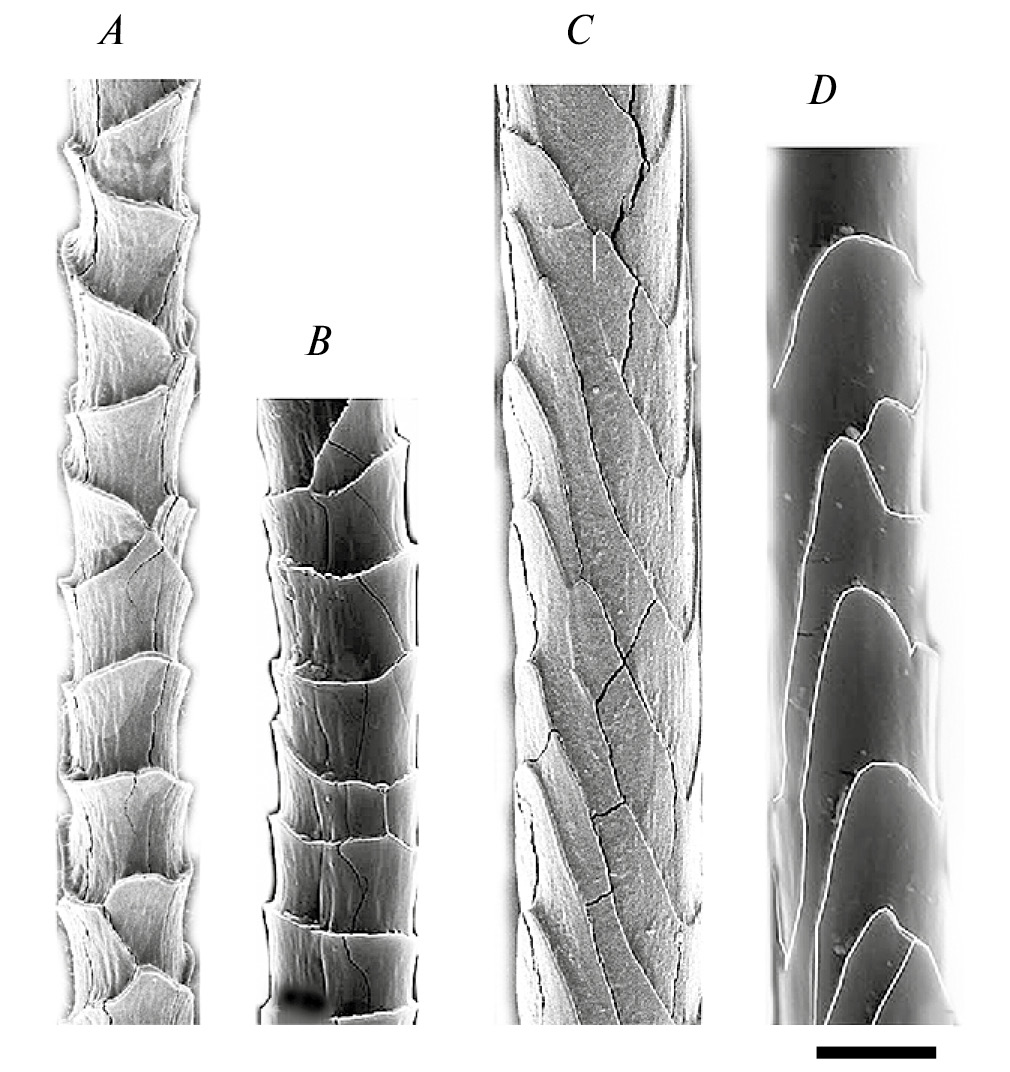 Рис. 6. Сходство орнамента кутикулы остевых волос холки Urocricetus kamensis (A, C), Phodopus sungorus (B) и Ph. campbelli (D). A, B – основание волоса; C, D – выше по стержню перед гранной. Данные РЭМ. Масштаб 10 мкм.