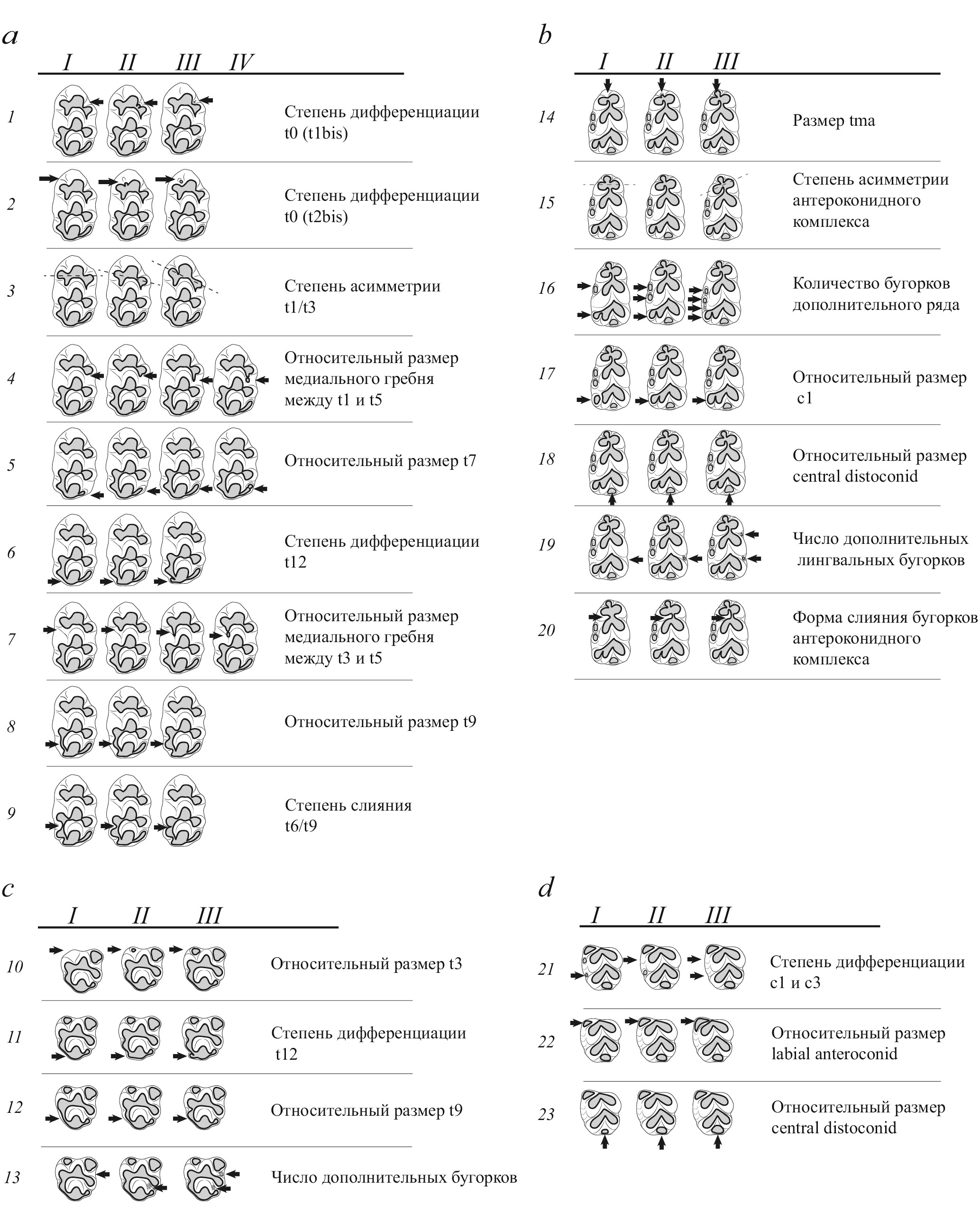 Рис. 3. Список неметрических признаков первого и второго верхних моляров и первого и второго нижних моляров Muridae (1–23), а также диапазон их вариаций (I–IV): a – первый верхний моляр (M1), b – первый нижний моляр (m1), c – второй верхний моляр (M2), d – второй нижний моляр (m2).