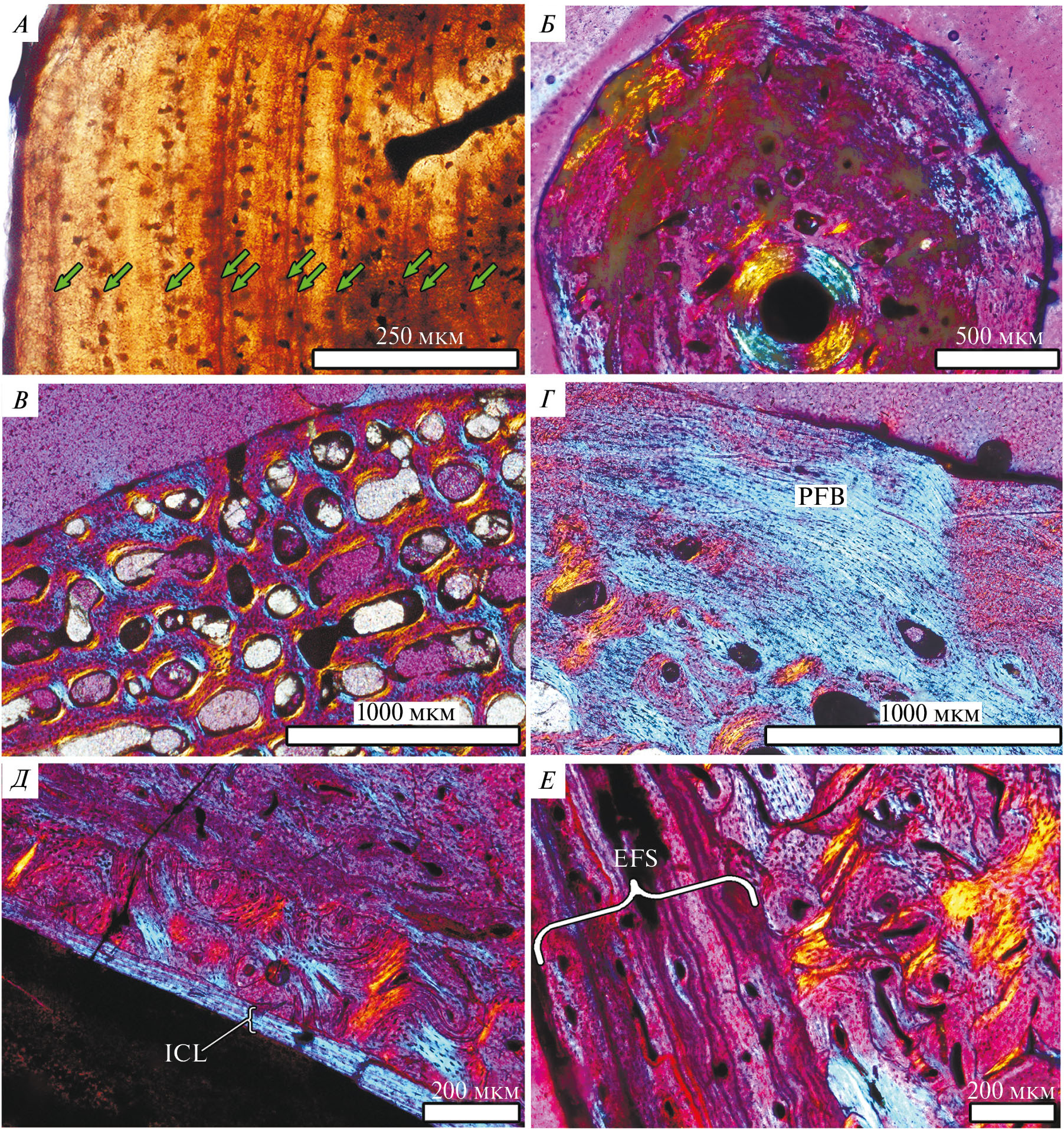 Рис. 4. Поперечные срезы костей конечностей ископаемых тетрапод в нормальном (А) и поляризованном свете с волновой пластинкой (Б–Е). А – примитивная раннемеловая стволовая саламандра Kulgeriherpeton ultimum, срез плечевой кости на уровне середины диафиза (см. Skutschas et al., 2024). Отсутствие сокращения дистанции между циклическими ростовыми метками свидетельствует о том, что эта плечевая кость принадлежала активно растущему животному, еще не достигшему максимального индивидуального возраста. Обратите также внимание на наличие двойных LAGs. Желтыми стрелками обозначены ростовые метки. Б – примитивная позднемеловая криптобранхидная саламандра Eoscapherpeton asiaticum, срез бедренной кости на уровне середины диафиза (см. Skutschas et al., 2019). Обратите внимание на сеть васкулярных каналов в первичном кортексе, которая появляется на поздних этапах онтогенеза. В – позднепермский парейазавр Deltavjatia rossica, срез большой берцовой кости особи, достигшей менее чем 25% от максимального размера (см. Boitsova et al., 2019). Присутствие только быстрорастущей костной ткани (фиброламеллярной кости) в кортексе свидетельствует о том, что эта кость принадлежала ювенильной особи на стадии изначального быстрого роста. Г – позднепермский парейазавр Deltavjatia rossica, срез бедренной кости особи, достигшей примерно 50% от максимального размера (см. Boitsova et al., 2019). Появление в кортексе параллельно-волокнистой кости свидетельствует о замедлении роста и окончании ювенильной стадии. Д – позднемеловой базальный орнитомимид, срез бедренной кости среднеразмерной особи (см. Skutschas et al., 2017). Обратите внимание на наличие внутреннего кругового слоя у особи, не достигшей максимальных размеров. Е – позднемеловой базальный орнитомимид, срез бедренной кости крупной особи (см. Skutschas et al., 2017). Наличие внешней фундаментальной системы свидетельствует о том, что животное является взрослым и достигшим скелетной зрелости. EFS – внешняя фундаментальная система, ICL – внутренний круговой слой, PFB – параллельно-волокнистая кость.