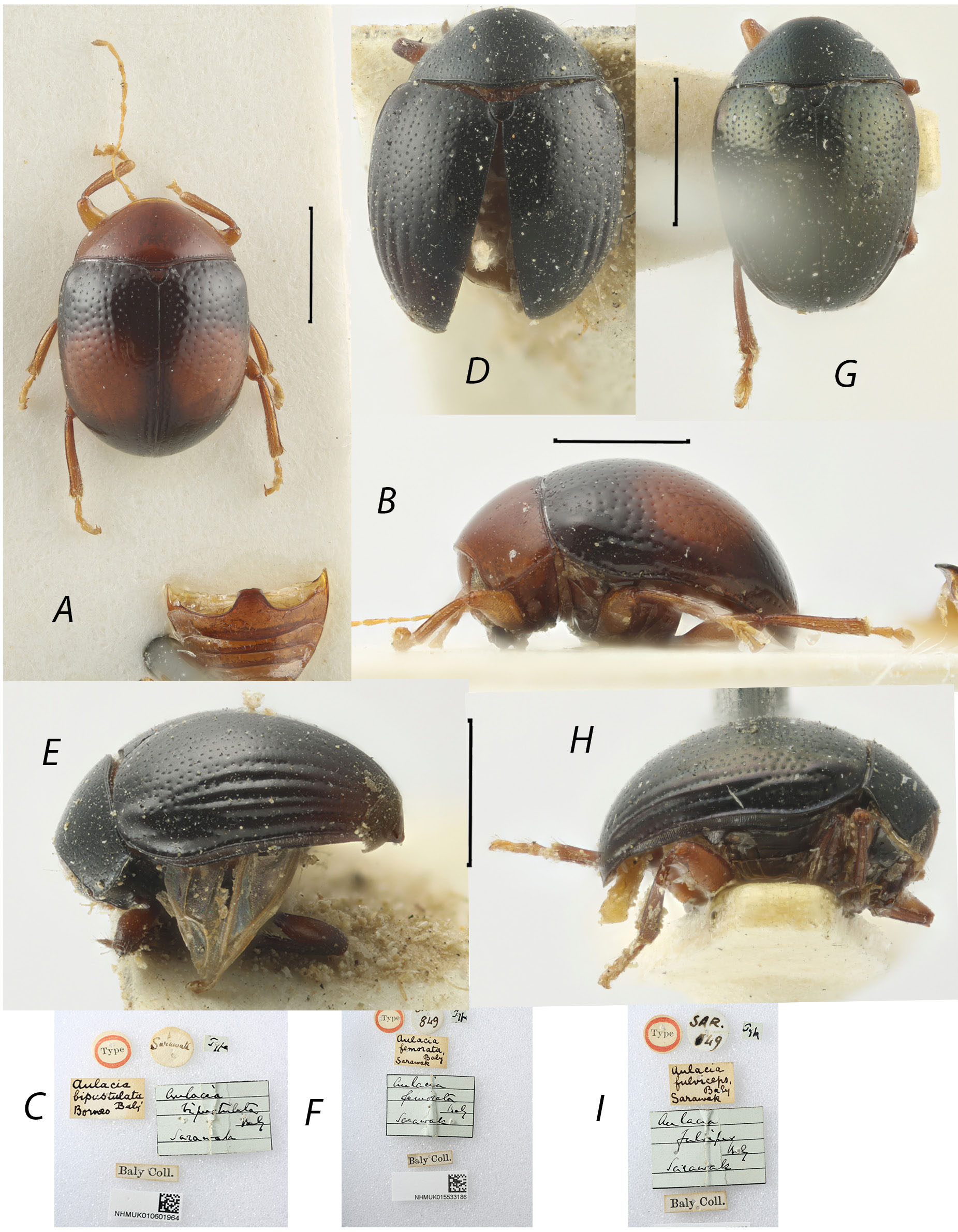 Примечание. Этот вид был описан по одной самке, самцы до настоящего момента были неизвестны. Изученный мною материал включал самок, полностью соответствующих описанию голотипа. Самцы, собранные в одном локалитете с самками, имеют сходные с ними признаки (кроме килей на боках надкрылий). Поэтому возникла необходимость привести фотографии внешнего вида самцов этого вида (рис. 2B) и их эдеагуса (рис. 14F–14H). В ревизии рода Aulacia (L. Medvedev, 2004а) этот вид, на тот момент еще не описанный, был ошибочно приведен как A. brunnea Jacoby 1894.