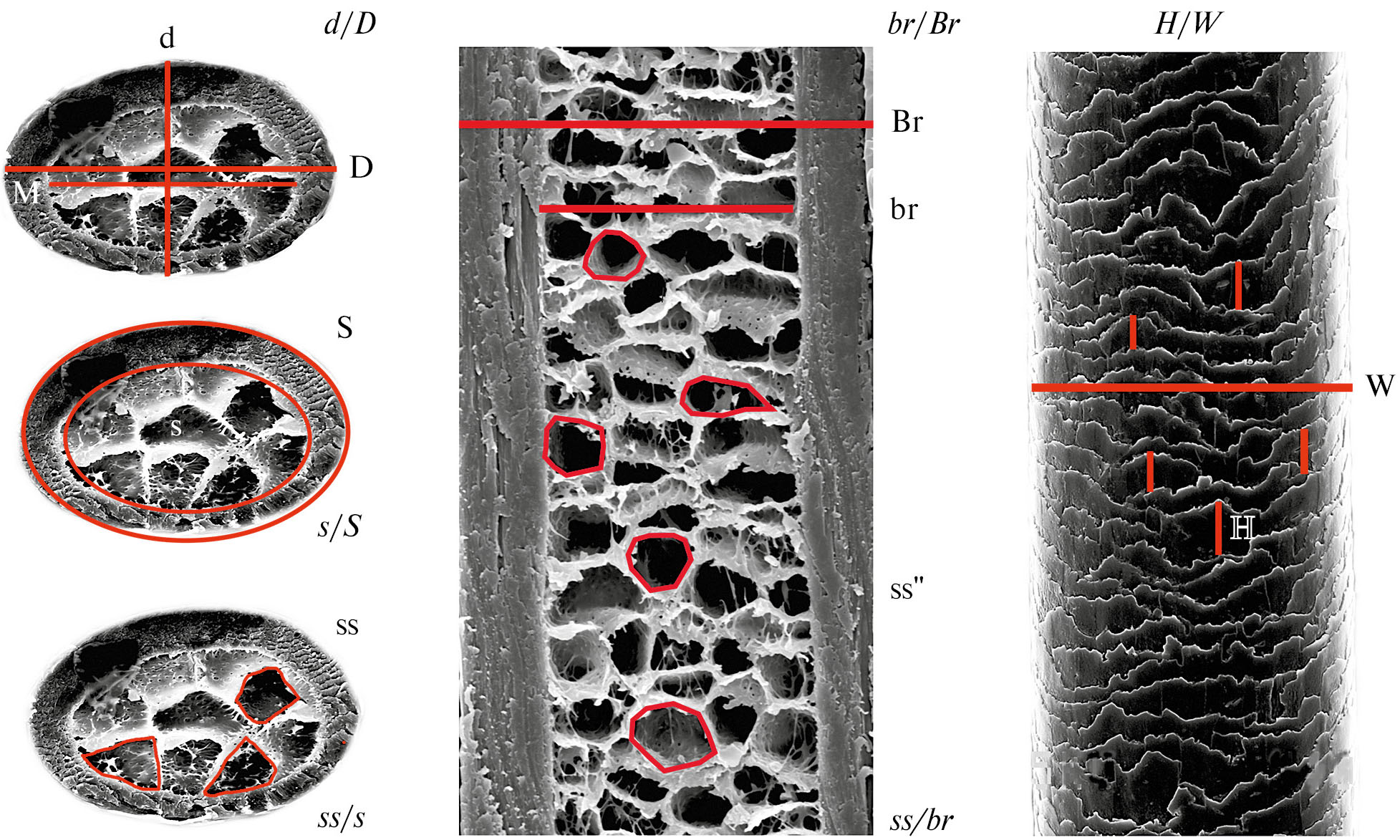 Рис. 1. Схема промеров микроструктур остевых волос лошадей. Поперечные и продольные сечения стержня: D и d – соответственно максимальный и минимальный диаметр волоса, мкм; М – максимальный диаметр сердцевинного тяжа, мкм; S и s – соответственно площадь сечений стержня и сердцевинного тяжа, мкм2; ss – площадь отдельной воздушной полости сердцевины, мкм2; Br – ширина волоса в поперечном сечении, мкм; br – ширина сердцевинного тяжа на поперечном сечении, мкм; ss″ – площадь отдельной воздушной полости сердцевины, мкм2. Интактный волос: H – высота чешуйки кутикулы вдоль стержня, мкм; W – ширина стержня волоса в месте измерения чешуек, мкм. Вычисленные индексы, %: d/D, M/D, s/S, ss/S, br/Br, ss″/br, H/W.