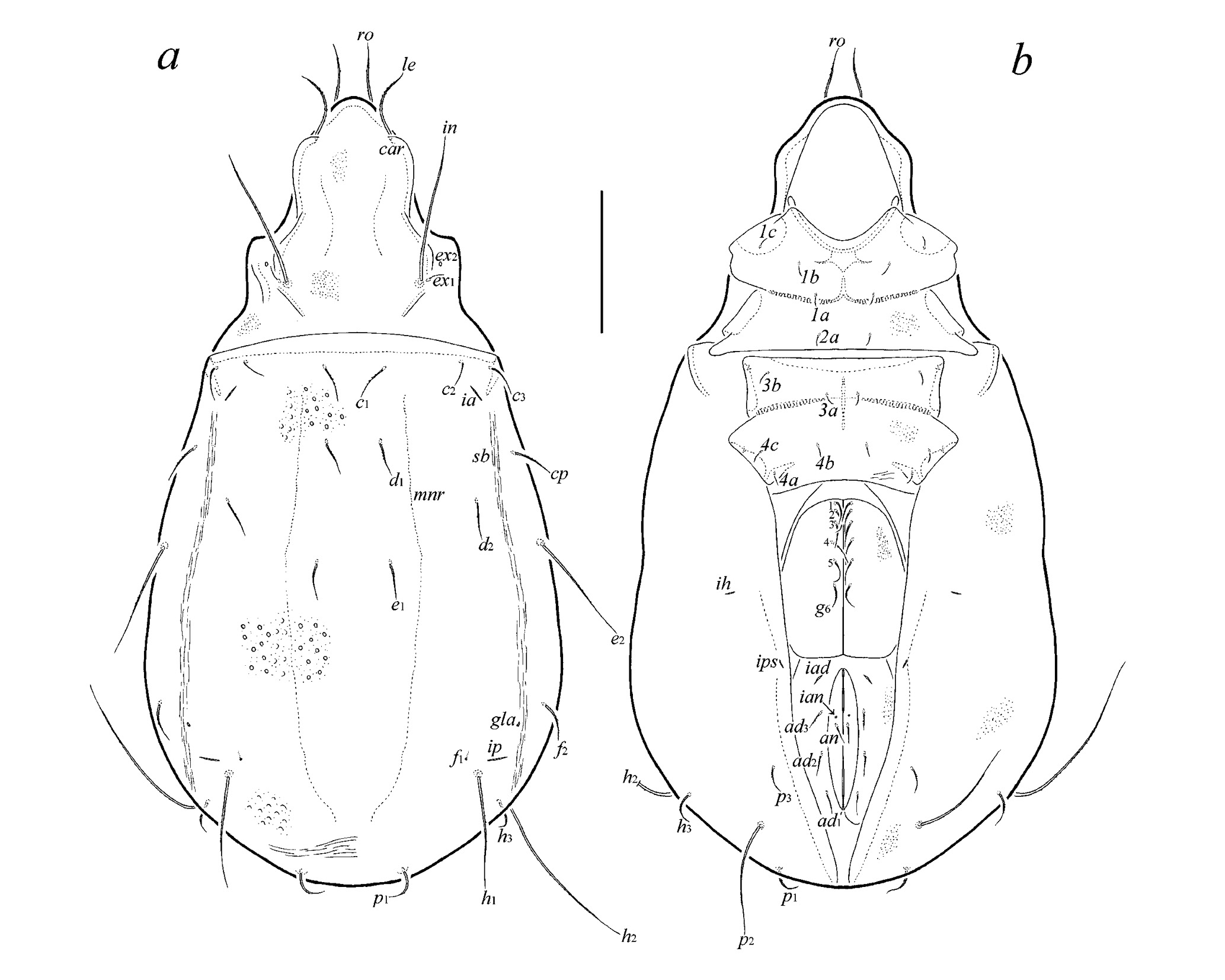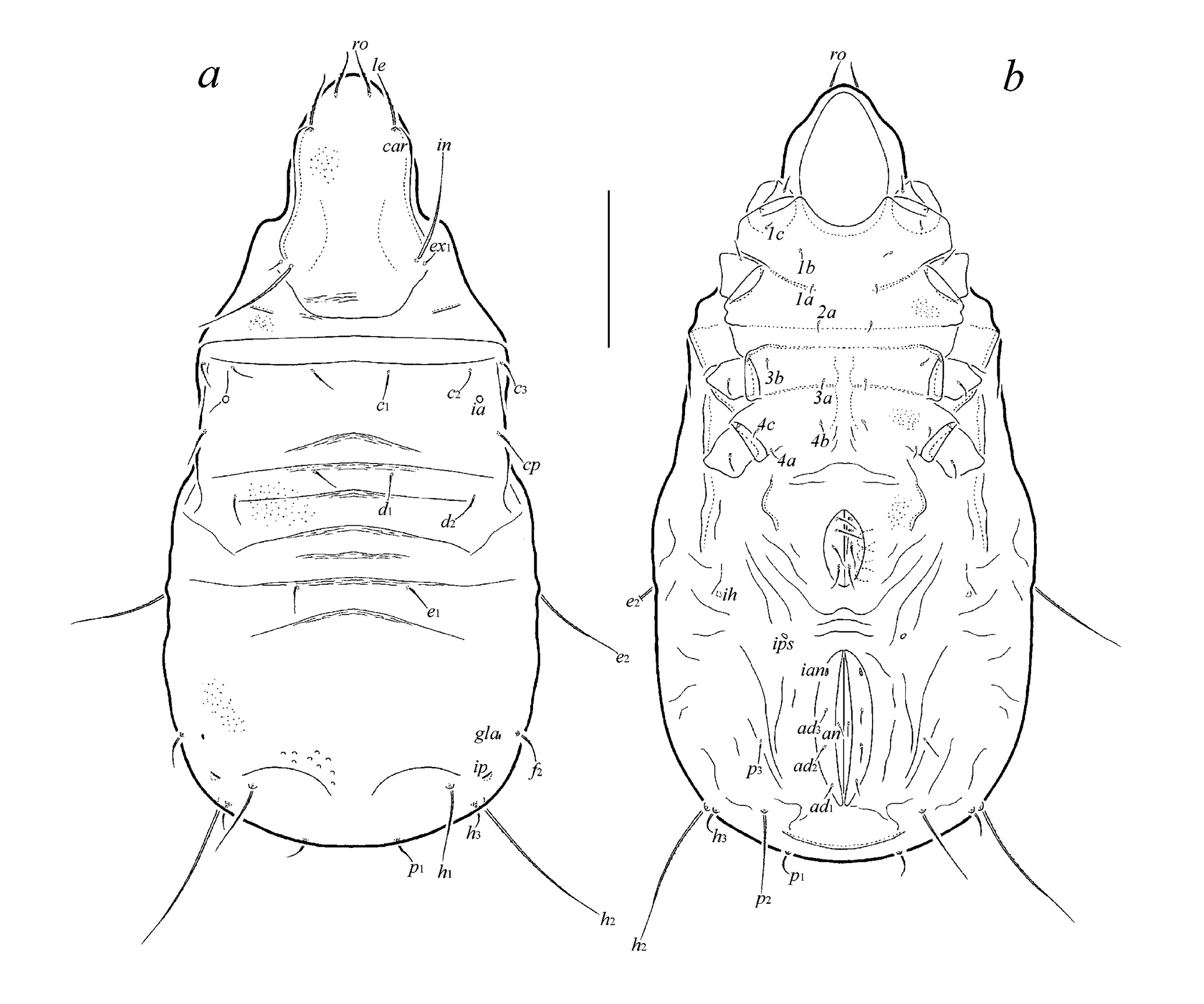 Fig. 3. Tyrphonothrus pinarensis Ermilov sp. n., tritonymph (gnathosoma and legs not shown): a – dorsal view, b – ventral view. Scale bar 100 µm