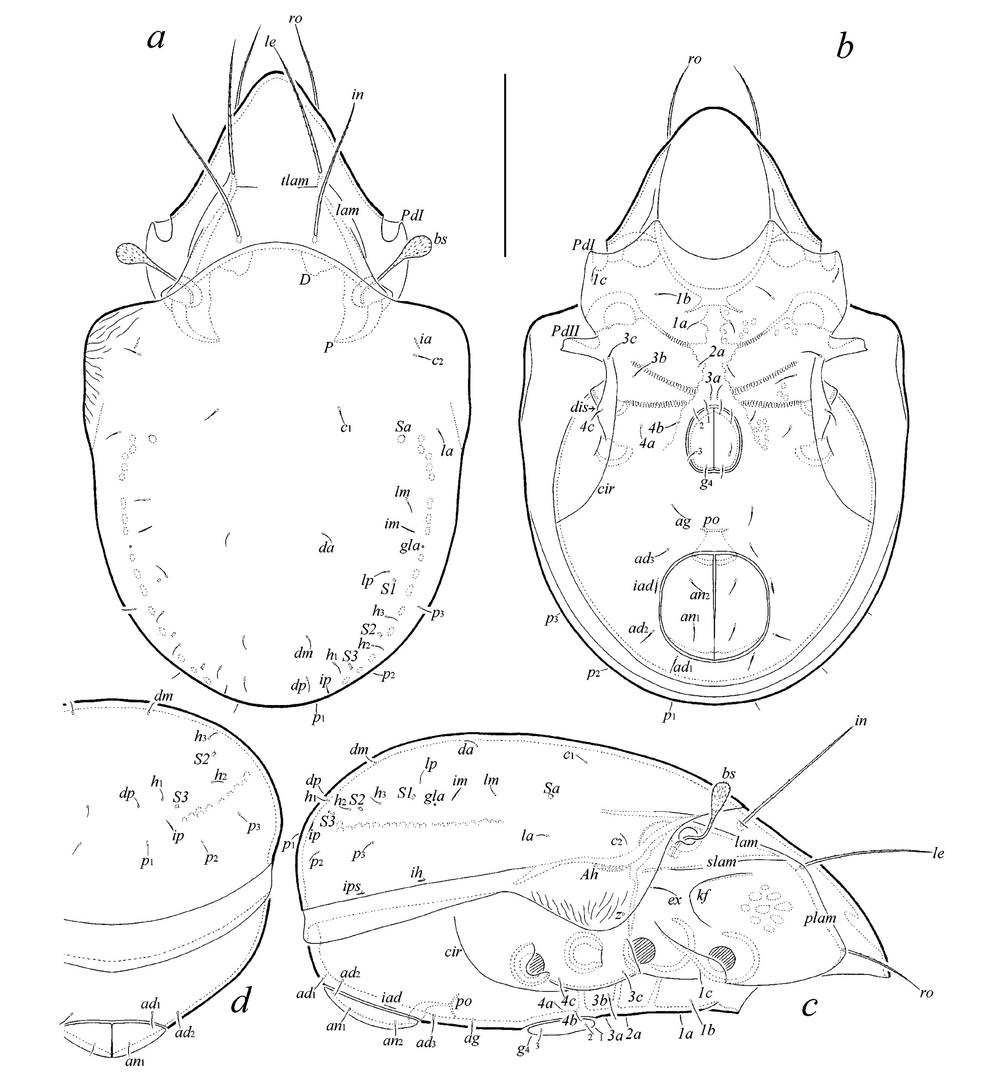 Abbreviations and notations. Prodorsum: lam = lamella; car = carina; plam = prolamella; tlam = translamella; slam = sublamella; kf = keel-shaped ridge; ro, le, in, bs, ex/ex1 = rostral, lamellar, interlamellar, bothridial, and exobothridial setae, respectively; ex2 = vestige of second exobothridial seta; D = dorsophragma; P = pleurophragma. Notogaster: mnr = medial notogastral ridge; sb = striate band; c, сp, d, e, f, da, dm, dp, la, lm, lp, h, p = setae; Sa, S1, S2, S3 = sacculi; ia, im, ip, ih, ips = lyrifissures/cupules; gla = opisthonotal gland opening. Gnathosoma: a, m, h = anterior, middle seta of gena and hypostomal seta of mentum, respectively; d, l, cm, acm, ul, su, lt, vt, inf, sup = palp setae; ω = palp solenidion; ep = postpalpal seta; cha, chb = cheliceral setae; Tg = Trägårdh's organ. Epimeral and lateral podosomal regions: 1a, 1b, 1c, 2a, 3a, 3b, 3c, 4a, 4b, 4c = epimeral setae; z = aperture of supracoxal gland; Ah = humeral porose area; PdI, PdII = pedotecta I and II, respectively; dis = discidium; cir = circumpedal carina. Anogenital region: g, ag, an, ad = genital, aggenital, anal, and adanal setae, respectively; ian, iad = anal and adanal lyrifissures/cupules, respectively; po = preanal organ. Legs: Tr, Fe, Ge, Ti, Ta = trochanter, femur, genu, tibia, and tarsus, respectively; pa = porose area; ω, σ, φ = solenidia; ɛ = famulus; d, l, v, ev, bv, ft, tc, it, p, u, a, s, pv, pl = setae. Instars: TN = tritonymph; AD = adult.