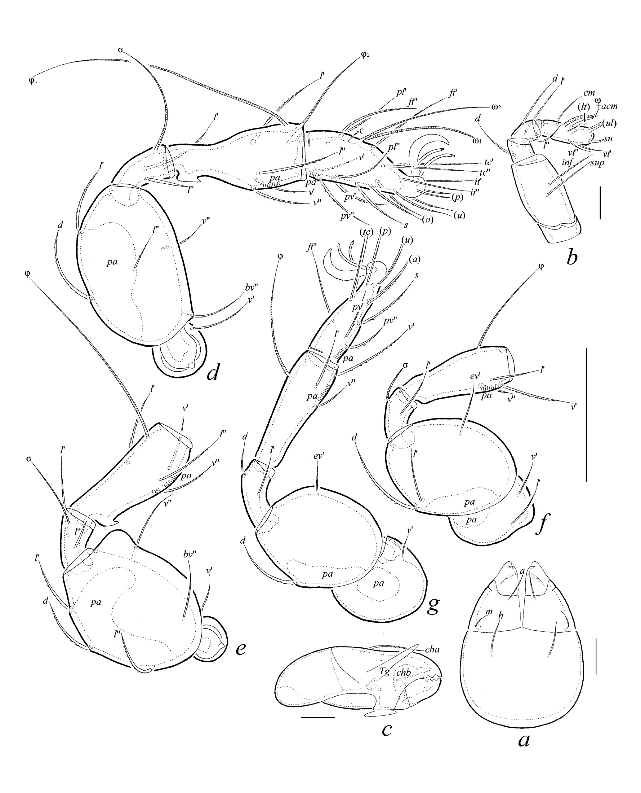 Fig. 2. Tyrphonothrus pinarensis Ermilov sp. n., adult: a – subcapitulum, ventral view; b – distal part of palp, right, antiaxial view; c – chelicera, right, antiaxial view; d – leg I, right, antiaxial view; e – leg II, right, antiaxial view; f – leg III, left, antiaxial view; g – leg IV, left, antiaxial view. Scale bar, μm: a–c – 20; d–g – 50