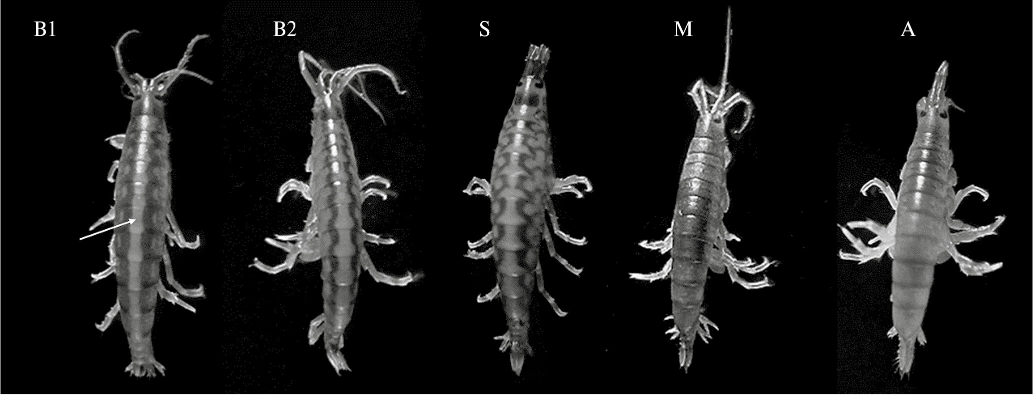 Анализу подвергали только живых особей. Для обездвиживания и анестезии использовали раствор гвоздичного масла. Далее с тела рачков удаляли воду фильтровальной бумагой. Особей длиной менее 5 мм, идентификация морф которых была затруднительна, не учитывали. Анализ проводили на микроскопе МБС-10. Фотографии изготовлены с помощью фотокамеры Canon EDS1100D.