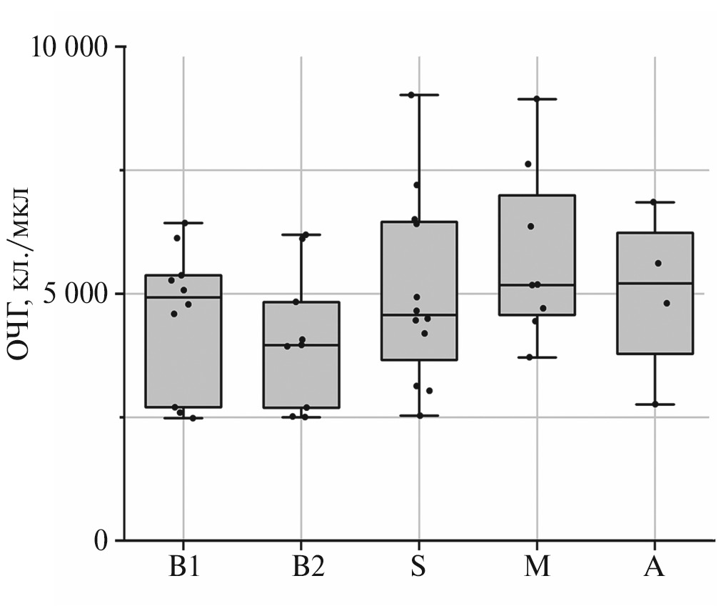 ОЧГ D. villosus находилось в широком диапазоне от 2480 до 9020 шт./мкл, среднее количество гемоцитов составило 4858 ± 1684 шт./мкл. Корреляционных связей между размером особей и числом гемоцитов установлено не было (p > 0.05). Также не было установлено различий по ОЧГ между самцами и самками (p > 0.05). Различия между пятью морфами были статистически недостоверны (p = 0.36) (рис. 5). Статистически достоверные различия при попарном сравнении между морфами не наблюдались (p > 0.05), однако у морфы M ОЧГ было в 1.4 раза выше по сравнению с B2 (p = 0.054).