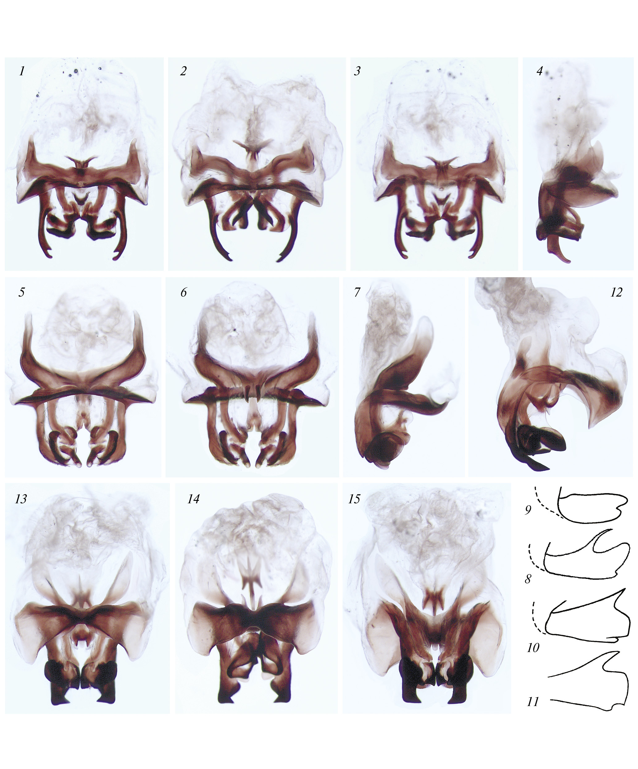 Рис. 2. Гениталии самца сверху (1, 2, 5, 13, 14), снизу (3, 6, 15) и сбоку (4, 7, 12), а также заднебоковая лопасть эпифаллуса сбоку (8–11): 1–4 – Niquirana? chiriqui sp. n. (2 – с втянутыми эктопарамерами); 5–8 – Luzara cusco sp. n.; 9 – L. ucayali Gor.; 10 – L. venado venado Gor.; 11 – L. v. major Gor.; 12–15 – Amusodes? festae Heb. (14 – с втянутыми эктопарамерами) [9, 10, 11 – по: Gorochov (2019)]