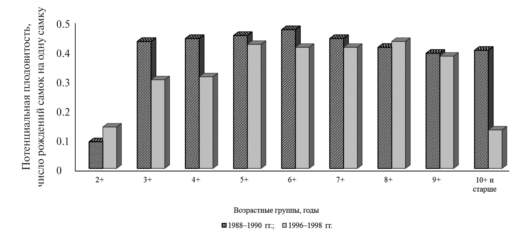 Обработка исходных материалов в период 1987–1990 гг. из работы Колпащикова (2000), представленных 1142 взрослыми самками, показала, что взвешенная средняя потенциальная плодовитость (Коли, 1979) в период 1987–1990 гг. составила 0.412 плода-самки на одну самку (табл. 3). Максимальными показателями потенциальной плодовитости характеризовался класс 6-летних самок: 0.470 плода-самки на одну самку этой возрастной группы. Для этого же класса животных на этом временном отрезке зафиксирована и самая низкая яловость среди представленных когорт взрослых самок – 6.03%. Таким образом, доля беременных самок среди половозрелых двулетних самок составила 19.1%, среди шестилетних самок – 93.97%. После достижения шестилетнего возраста в этой возрастной группе наблюдалось снижение потенциальной плодовитости, т. е. репродуктивный вклад уменьшался из-за промыслового изъятия и естественной смертности по другим причинам. В охотничье-промысловые сезоны 1987–1990 гг. средняя норма изъятия из популяции равнялась 87.5 тыс. самцов и самок (Колпащиков и др., 2002). Тем не менее имеющееся на тот период времени репродуктивное ядро взрослых самок в таймырской популяции компенсировало такую величину хозяйственного изъятия (см. табл. 2).