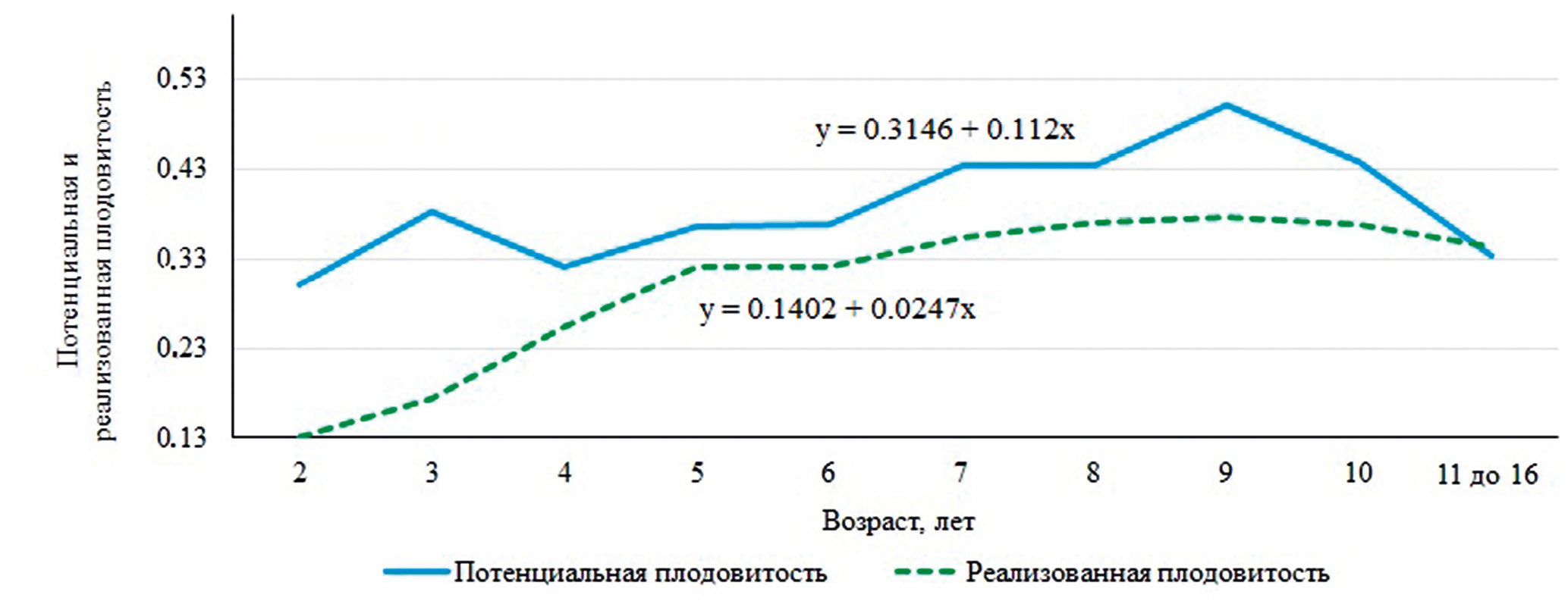 Тем не менее у некоторых самок таймырских диких северных оленей (Rangifer tarandus (L. 1758)) Мичуриным (1964) репродуктивная активность была отмечена на втором году жизни, т. е. в возрасте 15–16 месяцев. Согласно результатам исследований Колпащикова, Павлова (2001), в миграционных весенних потоках 1981–1998 гг. (n = 2342 самки) бóльшая часть важенок таймырской популяции приносят первое потомство в трехлетнем возрасте. Как правило, высокие значения средней плодовитости среди животных характерны для средневозрастных когорт самок 4–7 лет, обеспечивающих максимальный репродуктивный вклад в устойчивую скорость роста численности популяции в естественных условиях (Павлов и др., 1985; Колпащиков, 2000; Шапкин, 2012, 2016). По материалам Колпащикова, Павлова (2001), отдельные самки таймырских тундровых оленей сохраняют способность к размножению до 19 лет, по нашим данным, – до 15–16-лет (Шапкин, 2016; Шапкин, Суханова, 2021).