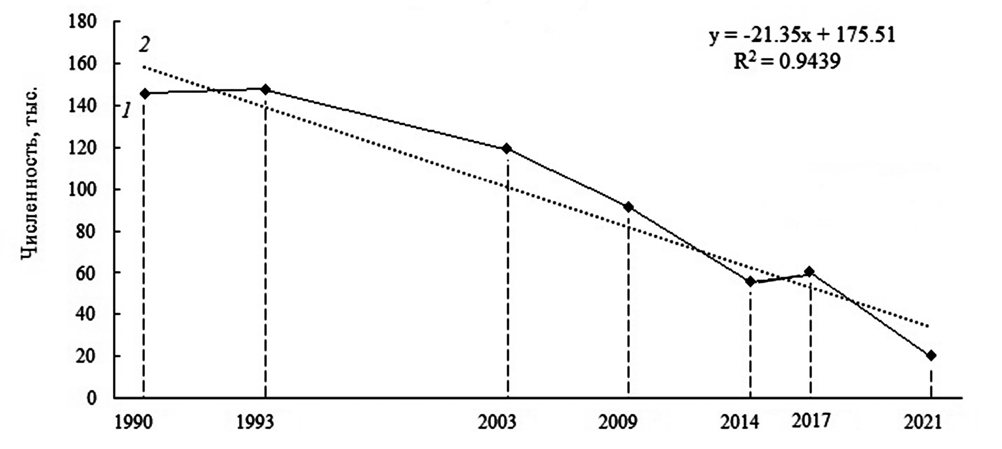 Таким образом, все подобные факты однозначно сигнализируют о бесконтрольном превышении оптимальной интенсивности промысла, поскольку налицо постепенное уменьшение “урожая” (Базыкин, 1985). Демографическое моделирование уравнением прямолинейного тренда данной половозрастной группы (телята-сеголетки) на временном отрезке 1990–2021 гг. дало отрицательное расчетное значение линейного уравнения регрессии в пределах у = –21.4х + 175.51 тыс. (R2 = 0.944, Ᾱ = 2.9%, r = 0.98, р < 0.01) (рис. 3), тогда как в советский период планово-административного использования ресурсов таймырской популяции линейный тренд численности телят-сеголетков за 1975–1990 гг. выражался положительным значением уравнения прогноза: y = 5.16x + 73.88 тыс. (R2 = 0.84, Ᾱ = 5.76%, r = 0.24, p < 0.05). Максимальный “урожай” этой половозрастной группы достигал 142.5 тыс. телят (июль 1988 г.) (Колпащиков, 2000).
