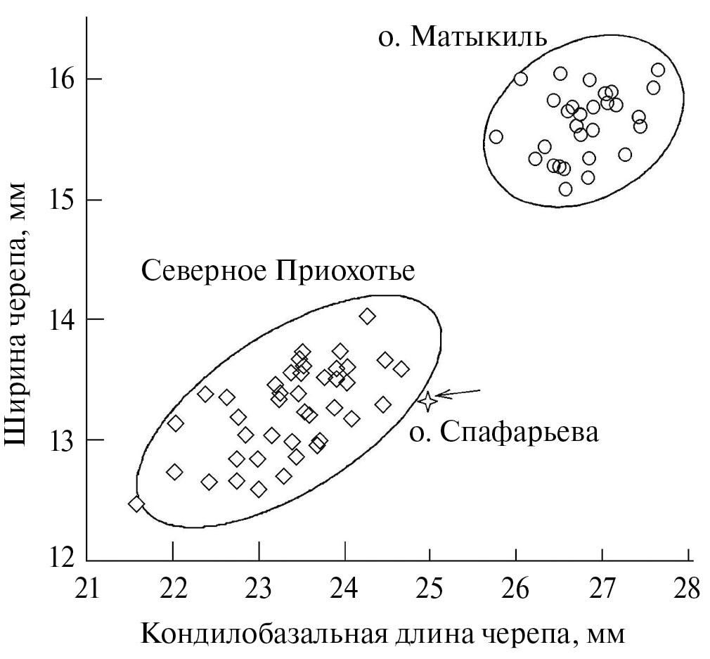 При сравнении островных и материковых полевок по двум промерам черепа (кондилобазальной длине и ширине), характеризующим его общие размеры, полевки с о-ва Матыкиль образовали компактное “облако”, оторванное от выборки с территории Северного Приохотья. При этом особь красной полевки с о-ва Спафарьева оказалась рядом с материковой выборкой (рис. 3).