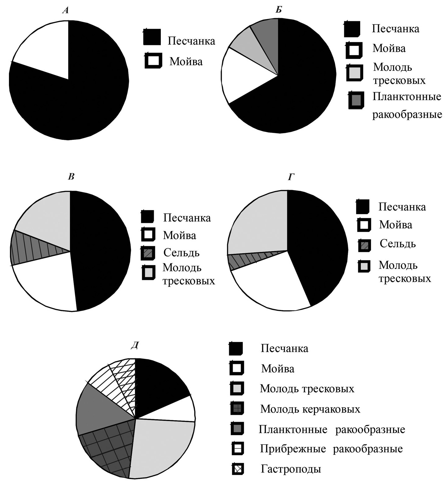 Рис. 1. Состав и относительная встречаемость кормов в желудках чистиковых в южном прибрежье Баренцева моря (1991–2020 гг.): А – гагарка, Б – тупик, В – тонкоклювая кайра, Г – толстоклювая кайра, Д – атлантический чистик.