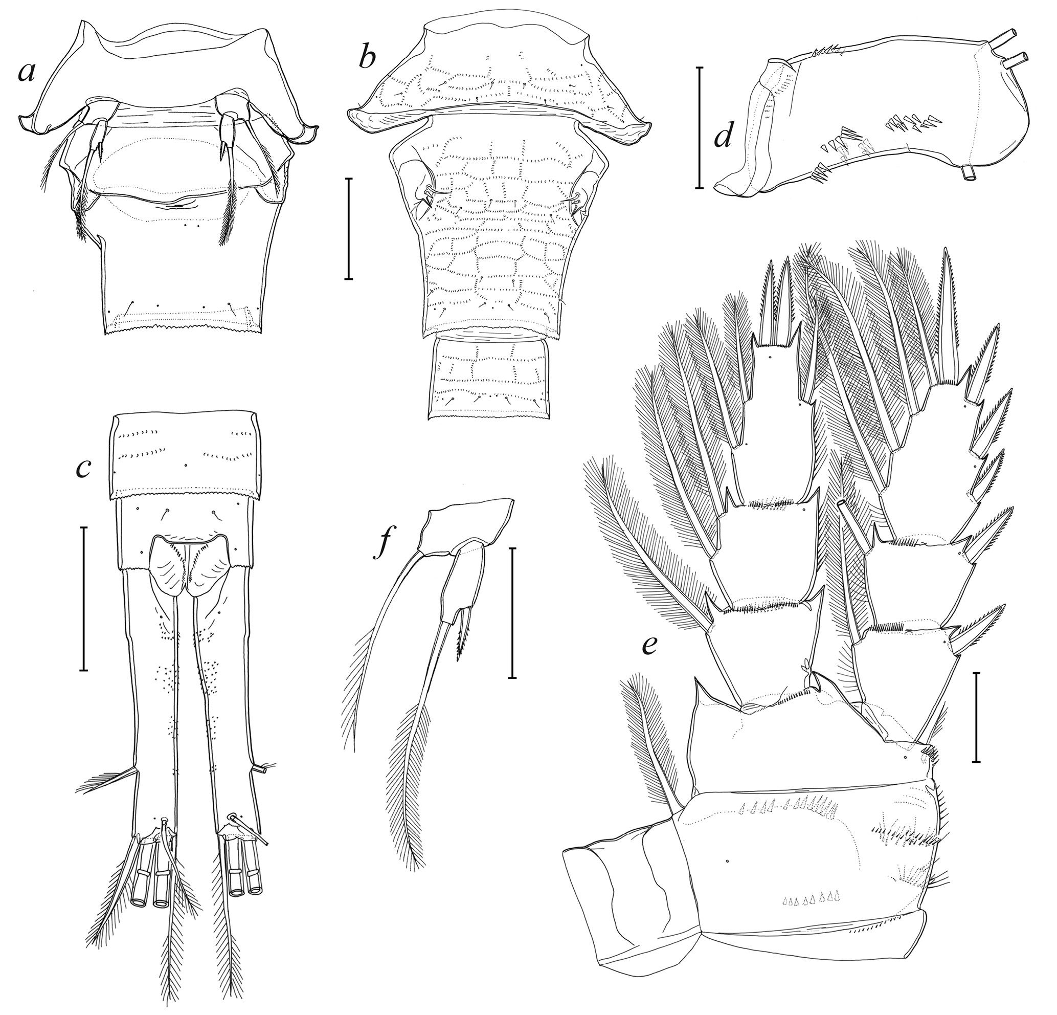 Описание. Самка (рис. 3a–3f). Тело крепкое, слегка уплощенное в дорсо-вентральном направлении, темно-коричневого цвета. Длина тела без хвостовых щетинок 1300–1907 мкм. Длина цефалосомы равна ширине, максимальная ширина близка к ее середине. Боковые углы 5-го торакального сомита несут короткие крыловидные выросты. Генитальный сомит примерно такой же длины, как ширина, округлой формы; семяприемник изображен на рис. 3b. Анальный сомит с рядом тонких длинных шипиков вдоль заднего края на вентральной стороне и крошечных шипиков на дорсальной стороне; проктодеум с одиночным рядом сетул с обеих сторон.