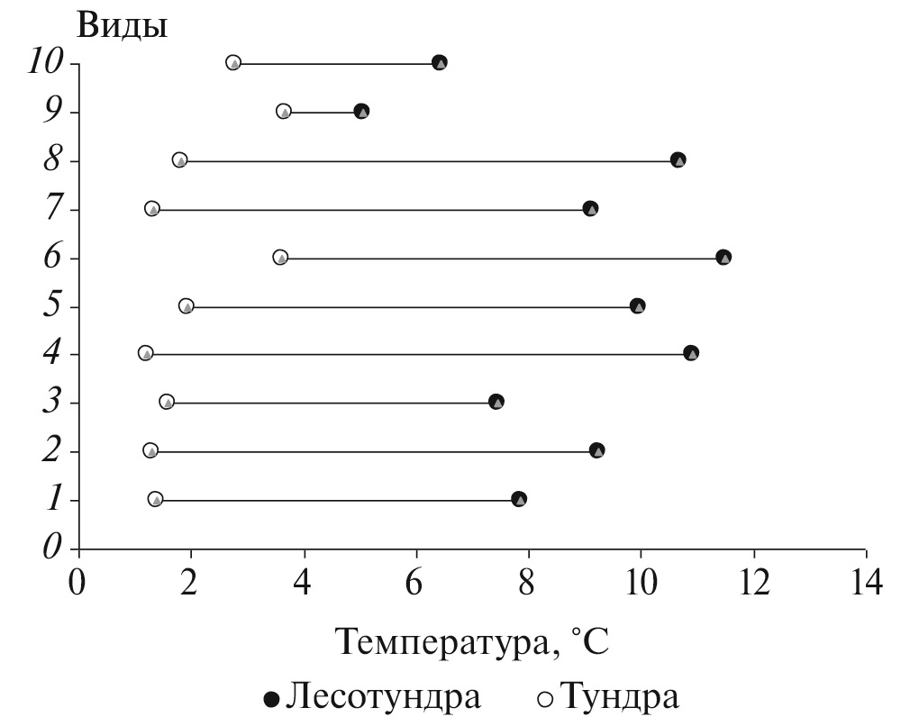 Рис. 2. Температуры начала яйцекладки в лесотундре и тундре Ямала у некоторых видов птиц: 1 – A. pratensis, 2 – A. cervinus, 3 – M. alba, 4 – C. lapponicus, 5 – Ph. trochilus, 6 – Ph. collybita, 7 – G. svecica, 8 – O. pusillus, 9 – O. oenanthe, 10 – A. flammea.
