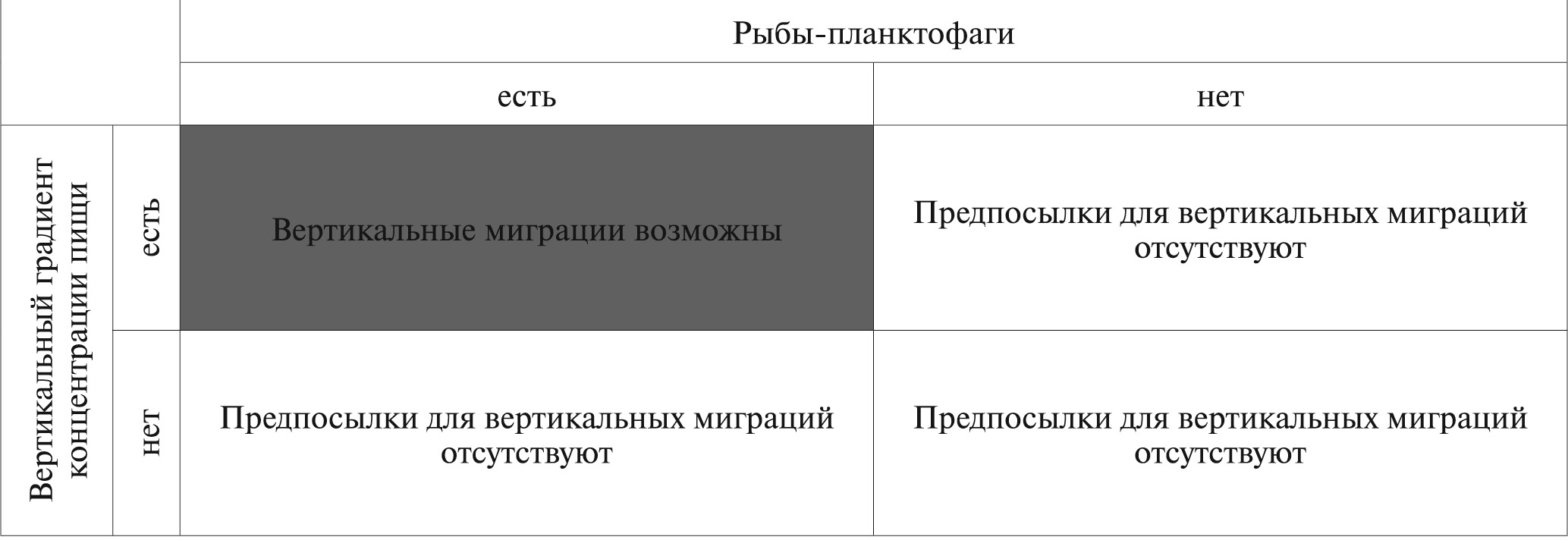 Однако причины вертикальных миграций планктонных ракообразных, по-видимому, сложнее, чем факторы индустриального меланизма у бабочек. В рассмотренной выше работе З. М. Гливич (Gliwicz, 1986), ссылаясь на данные своих учеников и коллег Петра Давидовича (Piotr Dawidowicz) и Иоанны Пьяновской (Joanna Pijanowska), отметил, что даже при наличии рыб вертикальные миграции не должны происходить в водоемах, где нет вертикального градиента концентрации пищи (см. Pijanowska, Dawidowicz, 1987). Действительно, если пища равномерно распределена в столбе воды, отбор не будет способствовать вертикальным миграциям, поскольку при этом энергия рачками не приобретается (пищи наверху не больше, чем в глубине), а только расходуется (движение требует энергетических трат). С другой стороны, в силу сказанного выше миграций не должно быть и в озерах, где нет рыб. Эти условия подробно обсуждались в работе З. М. Гливича и И. Пьяновской (Gliwicz, Pijanowska, 1988). Для облегчения восприятия логическое пространство возможностей, порождающих вертикальные миграции зоопланктона, можно представить в виде простой схемы (рис. 1).