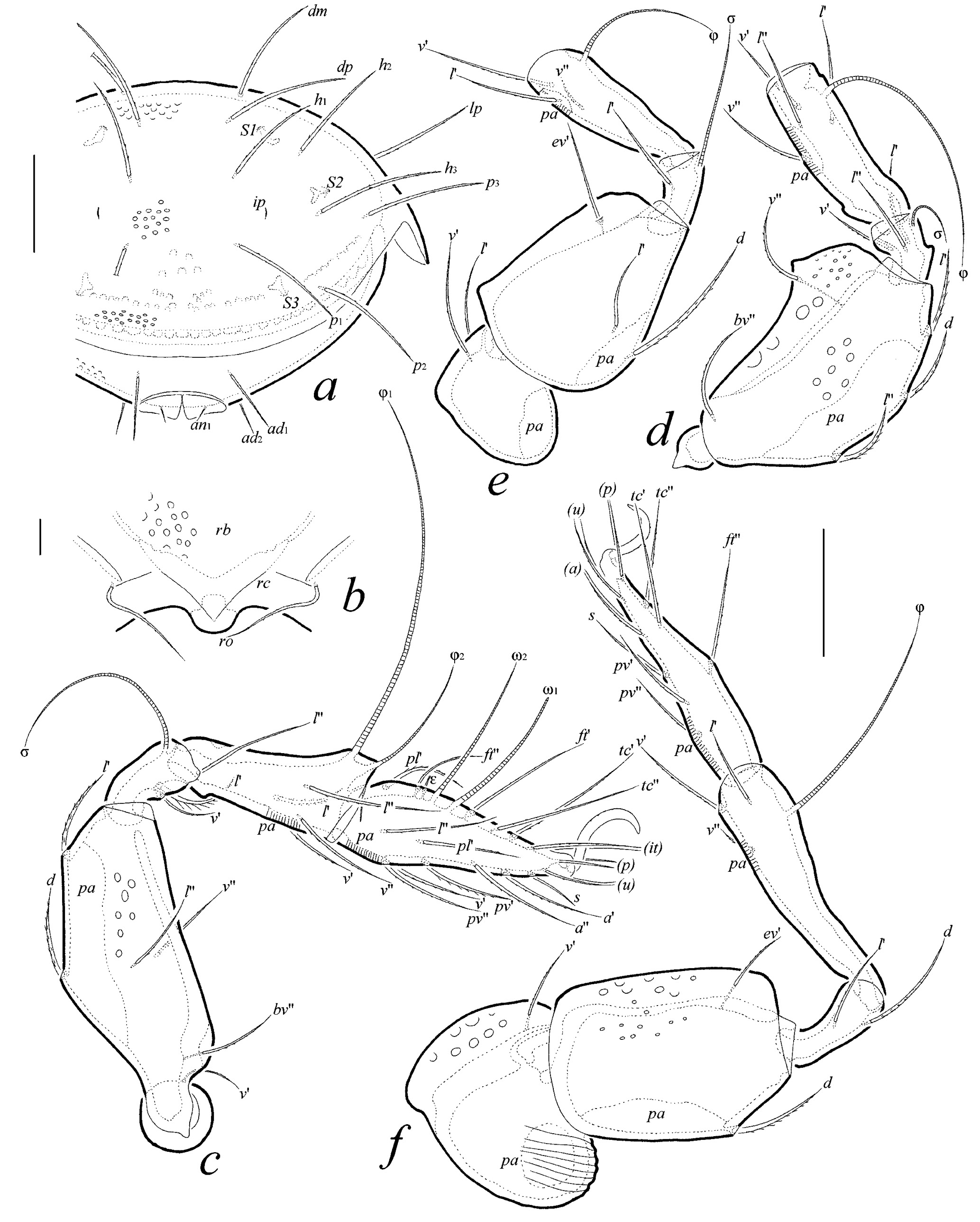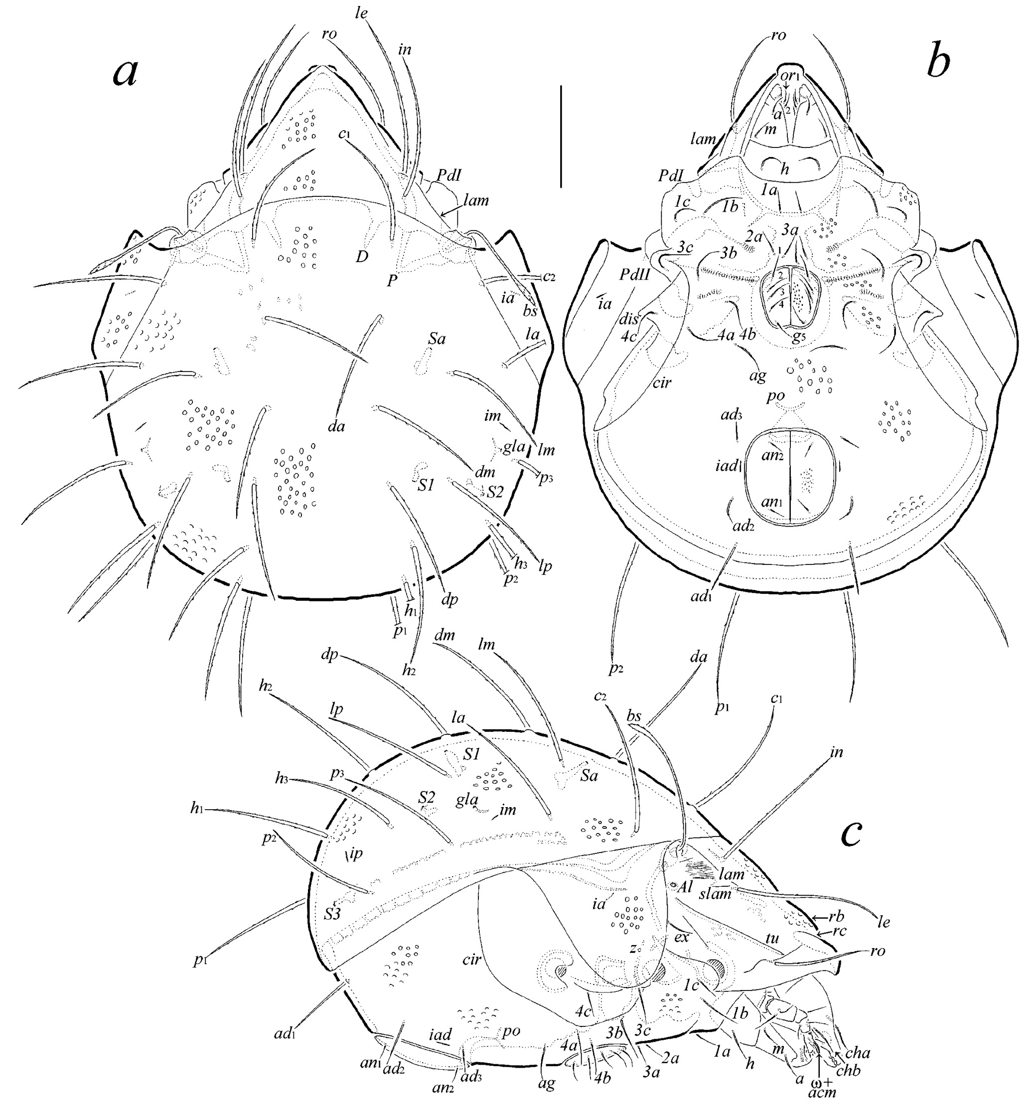 Abbreviations and notations. Prodorsum: rb = rostral bulge; rc = rostral carina; lam = lamella; slam = sublamella; Al = sublamellar porose area; tu = tutorium; ro, le, in, bs, ex = rostral, lamellar, interlamellar, bothridial, and exobothridial setae, respectively; D = dorsophragma; P = pleurophragma. Notogaster: c, da, la, dm, lm, dp, lp, h, p = notogastral setae; Sa, S1, S2, S3 = saccules; ia, im, ip, ih, ips = lyrifissures; gla = opisthonotal gland opening. Gnathosoma: a, m, h = subcapitular setae; or = adoral seta; acm = palp seta; ω = palp solenidion; cha, chb = cheliceral setae. Epimeral and lateral podosomal regions: 1a, 1b, 1c, 2a, 3a, 3b, 3c, 4a, 4b, 4c = epimeral setae; PdI, PdII = pedotecta I and II, respectively; dis = discidium; cir = circumpedal carina. Anogenital region: g, ag, an, ad = genital, aggenital, anal, and adanal setae, respectively; iad = adanal lyrifissure; po = preanal organ. Legs: Tr, Fe, Ge, Ti, Ta = trochanter, femur, genu, tibia, and tarsus, respectively; pa = porose area; ω, σ, φ = solenidia; ɛ = famulus; d, l, v, ev, bv, ft, tc, it, p, u, a, s, pv, pl = setae.
