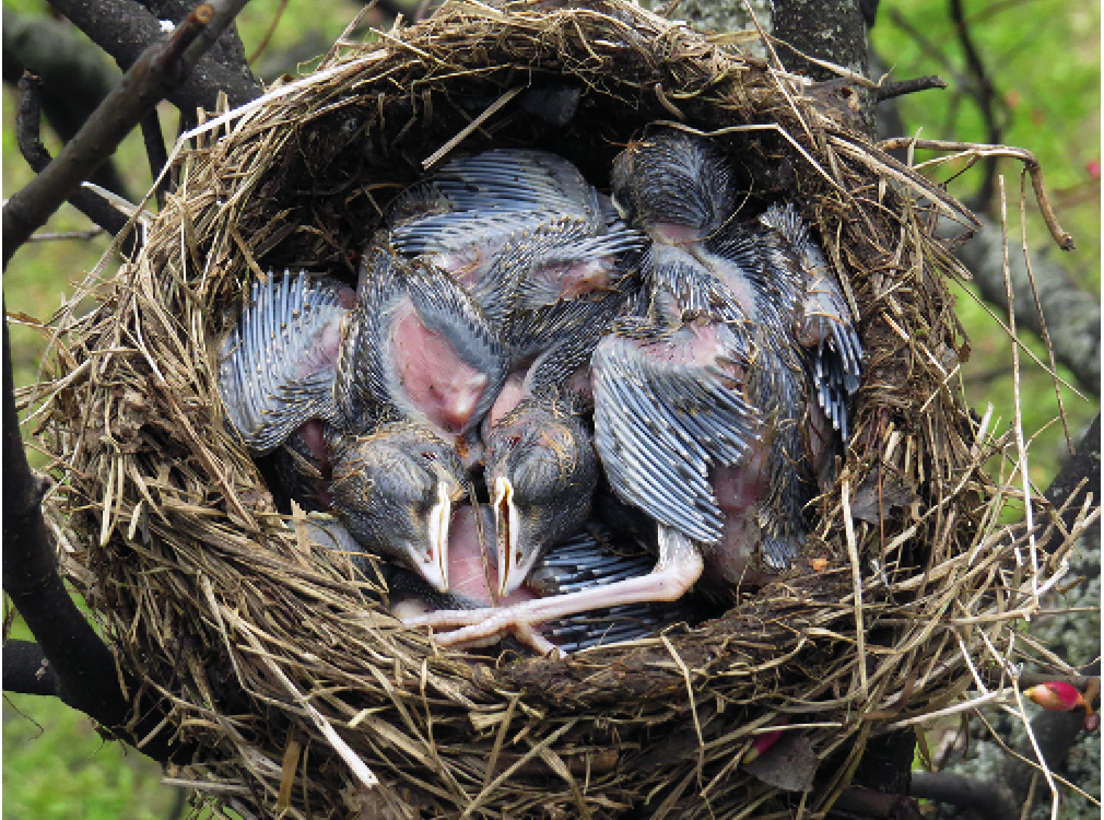Рис. 1. Гнездо рябинника с шестью птенцами в возрасте ~ от 5 до 7.5 суток без видимых травм, погибшими (не позднее середины дня 10 мая) во время непогоды 8–10 мая 2017 г. (территория МГУ, улица Лебедева, Воробьевы горы, Москва, 11 мая 2017 г.; фото автора).
