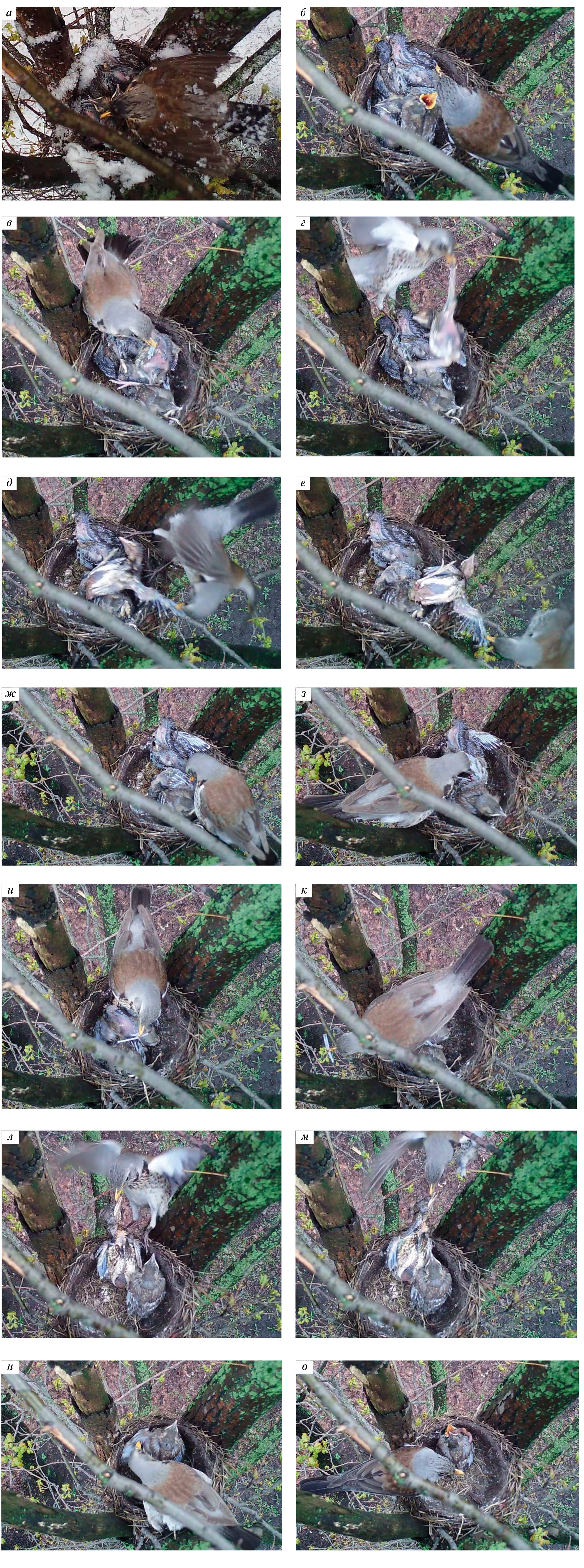 Рис. 3. Фрагменты событий (а–о, приведены в хронологическом порядке) в гнезде рябинника с пятью птенцами, погибшими в возрасте ~ от 7 до 9 суток вследствие непогоды 7–9 мая 2017 г. (территория спорткомплекса МГУ, Воробьевы горы, Москва; кадры видеозаписей, сделанных фотоловушкой Bushnell NatureView HD Cam with Live View, указано московское время суток UTC+3): а – самка на гнезде с тремя погибшими и двумя живыми птенцами (8 мая, 13:50); б – самец на гнезде с четырьмя погибшими и одним живым птенцами (этот и последующие снимки сделаны 9 мая, этот – в 9:49); в, г – самка схватила одного из четырех погибших птенцов за конец крыла (в) и выносит его (г) из гнезда (10:37); д, е – самка выносит следующего, одного из трех оставшихся погибших птенцов (10:45); ж – самка дергает живого птенца за основания растущих маховых перьев на левом крыле, вырванные перья проглатывает (10:46); з – у живого птенца на левом крыле видны проем и немного крови на месте вырванных самкой маховых перьев (11:08); и, к – самка поедает на месте (и – 11:56), реже уносит из гнезда (к – 12:08) растущие перья в чехлах, вырванные ею из крыла четвертого, еще не выброшенного мертвого птенца; л, м – самка тянет за надклювье четвертого погибшего птенца и едва не вытаскивает его из гнезда (12:46); н – ~ за полчаса до исчезновения из гнезда четвертого погибшего птенца (на фото он закрыт взрослой птицей) самка снова принимается выдергивать из крыла живого птенца перья и поедает их (13:45); о – самец принес дождевого червя, которого ослабевший птенец не смог ни проглотить, ни удержать в клюве (14:35).