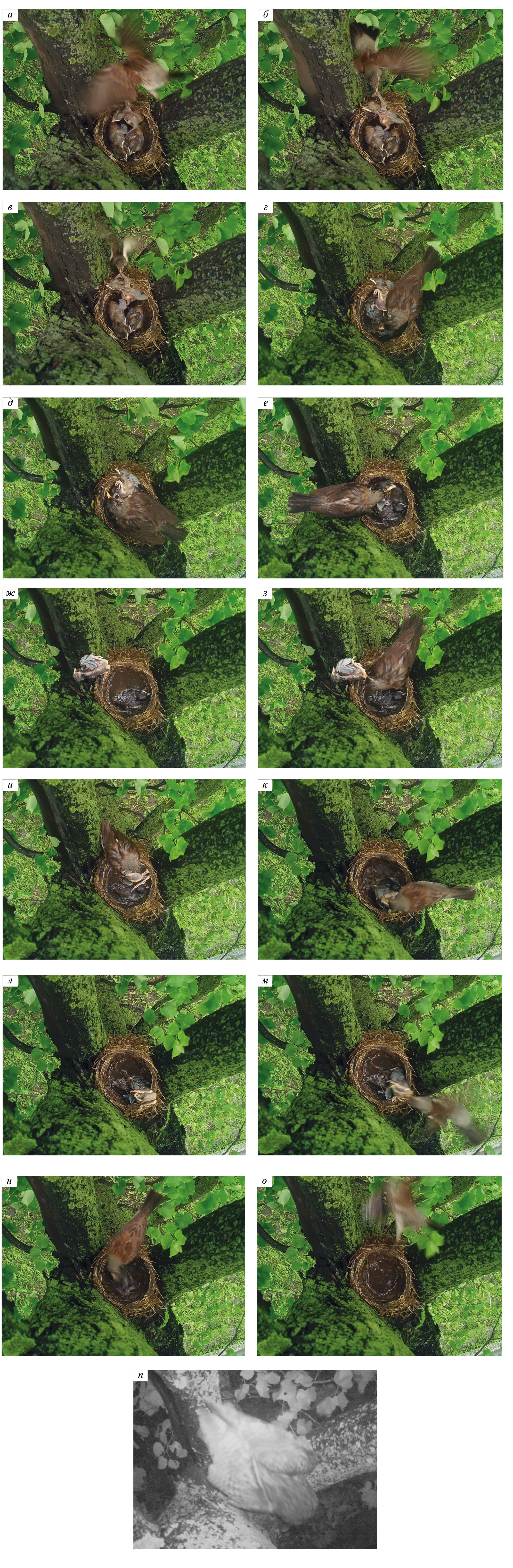 Рис. 4. Фрагменты событий (а–п, приведены в хронологическом порядке) в гнезде рябинника с пятью птенцами, погибшими в возрасте от ~6–6.5 до 9–9.5 суток из-за дождей в конце мая 2020 г. (улица Академика Хохлова возле Физического факультета МГУ, Воробьевы горы, Москва; снимки сделаны фотоловушкой Bushnell NatureView HD Cam with Live View): а, б, в – через 3 мин после выбрасывания мертвого птенца, самка пытается вынести из гнезда также “младшего” из четырех живых птенцов, ухватив его клювом за крыло, но не доводит эту попытку до конца (30 мая, ~13:16); г, д – вытащив из воды на дне лотка одного из трех погибших птенцов, самка водрузила его туловище на одно из двух других тел, а шею и голову – на верхний край гнезда (31 мая, ~8:20); е–и – самка схватила клювом одного из двух оставшихся мертвых птенцов (е), уложила боком на верхний край гнезда и проходящую вплотную толстую ветвь и улетела, оставив тело птенца в таком положении на 8–10 сек (ж), а вернувшись, втащила его назад в лоток (з, и) (31 мая, ~13:20–13:22); к–м – самка вытащила из воды на дне лотка одно из двух тел (к), на 3 секунды оставила его лежать на верхнем краю гнезда с опорой головой на второе тело (л), а затем выбросила из гнезда (м) (31 мая, ~16:32); н, о – самка выбрасывает последнего погибшего птенца (31 мая, ~16:33); п – пустое гнездо посетила ушастая сова (1 июня, ~1:29). Показания таймера фотоловушки пришлось немного корректировать, поэтому время суток указано приблизительно.