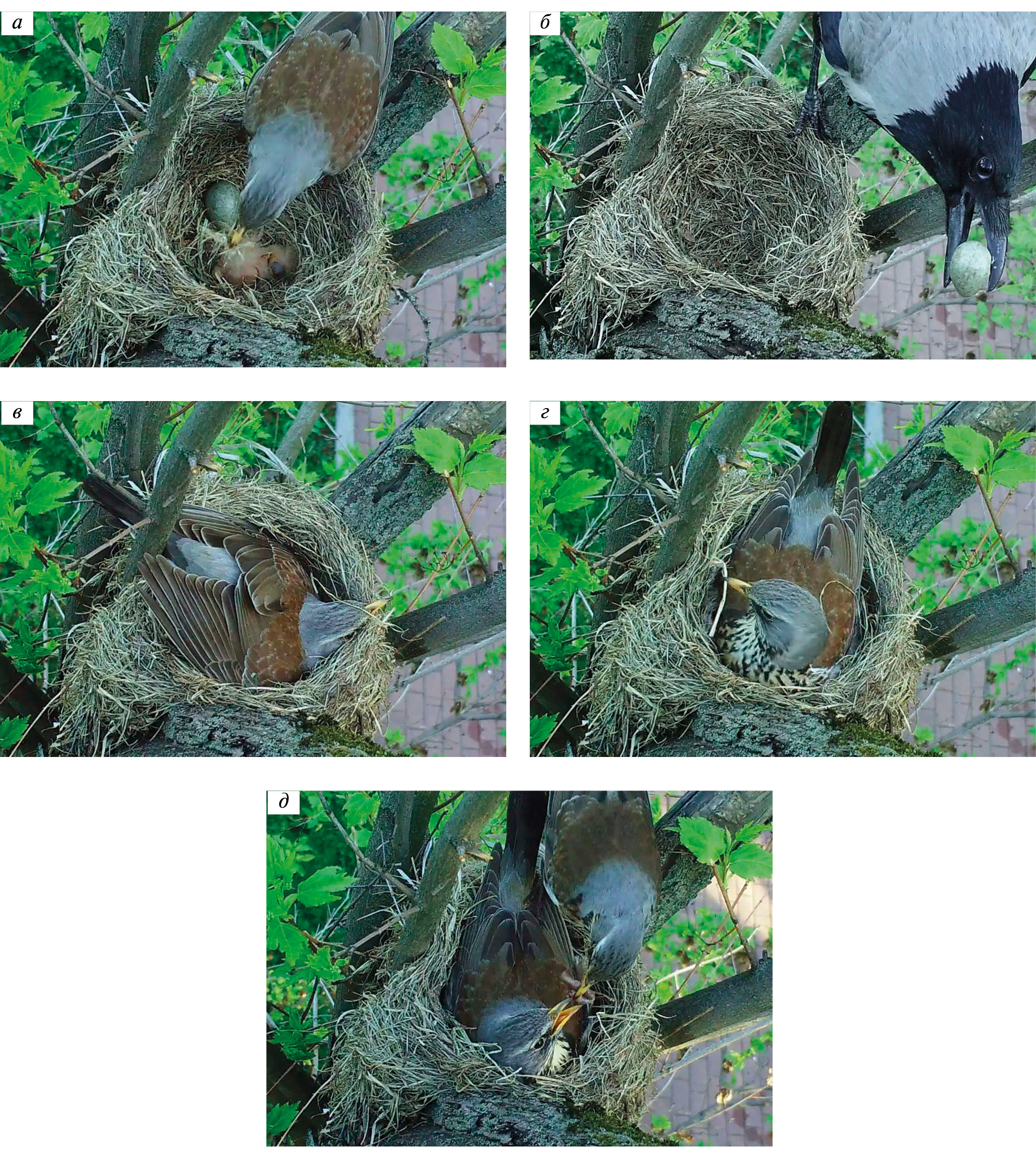 Рис. 7. Фрагменты событий (а–д, приведены в хронологическом порядке) в гнезде рябинника с пятью маленькими птенцами и одним яйцом, похищенными в три приема серыми воронами (сквер между Физическим и Химическим факультетами МГУ, Воробьевы горы, Москва, 8 мая 2018 г.; кадры видеозаписей, сделанных фотоловушкой Bushnell NatureView HD Cam with Live View): а – через 2 мин после похищения воронами четырех из пяти птенцов, самка рябинника выносит из лотка пучок гнездового материала (5:41); б – последним похищается яйцо (5:46); в – после похищения воронами потомства самка не только сидит в пустом гнезде, но и периодически трамбует лоток: быстро работая ногами, она по 1.5–3 сек надавливает грудью на дно, а сгибами полурасставленных крыльев, зобом, горлом и подхвостьем одновременно – на стены лотка (6:14); г – сидя в пустом гнезде, самка также поправляет торчащие из его верхнего края сухие травинки (6:14); д – дождевого червя, принесенного птенцам более чем через час после их исчезновения, самец пытается передать самке, сидящей в пустом гнезде (7:00).