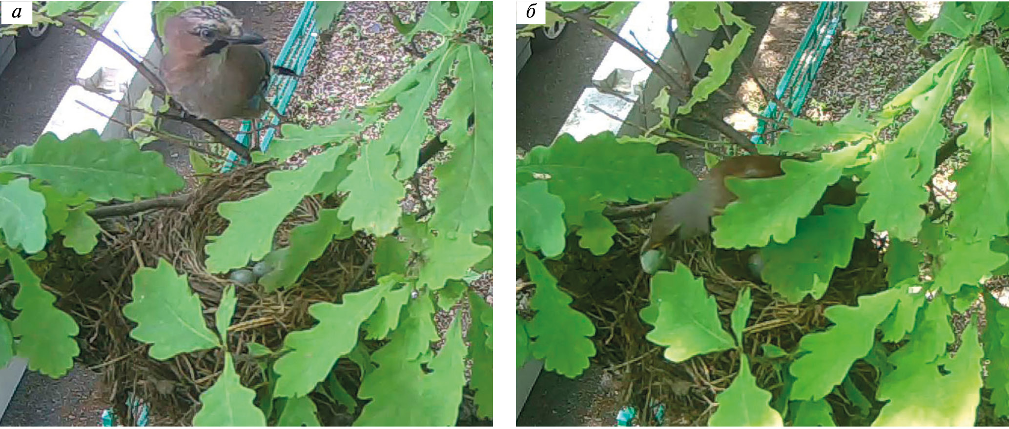 Рис. 8. Ликвидация рябинниками остатков кладки из четырех яиц, уничтоженной сойкой непосредственно в их гнезде (студенческая автопарковка МГУ, Воробьевы горы, Москва, 3 июня 2018 г.; кадры видеозаписей, сделанных фотоловушкой Seelock Spromise S128): а – сойка добралась до гнезда рябинника незамеченной (12:42); б – рябинник (по всей видимости, самка) выносит из гнезда скорлупу одного из съеденных сойкой яиц (12:49).