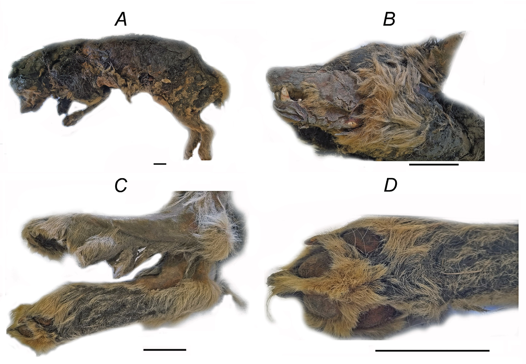 Рис. 1. Внешний вид взрослого самца плейстоценового волка (Canis lupus ssp.): A – найденная мумия, B – голова, C – стопы, D – кисть. Масштаб 5 см. Фото А. И. Климовского.