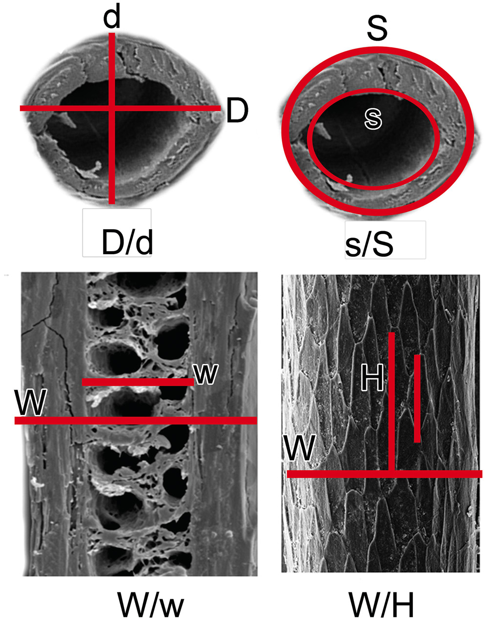 Рис. 2. Промеры микроструктур остевых волос взрослого самца плейстоценового волка (Canis lupus ssp.): D/d – отношение большего диаметра волоса к его меньшему диаметру на поперечном сечении, s/S ×100% – Индекс сердцевины 1 – отношение (%) площади сердцевинного тяжа к площади поперечного сечения волоса, W/w – Индекс сердцевины 2 – отношение толщины волоса к толщине сердцевины на продольном сечении, W/H – Индекс кутикулы – отношение толщины волоса к высоте кутикулярных чешуек на тотальном препарате. Данные СЭМ.