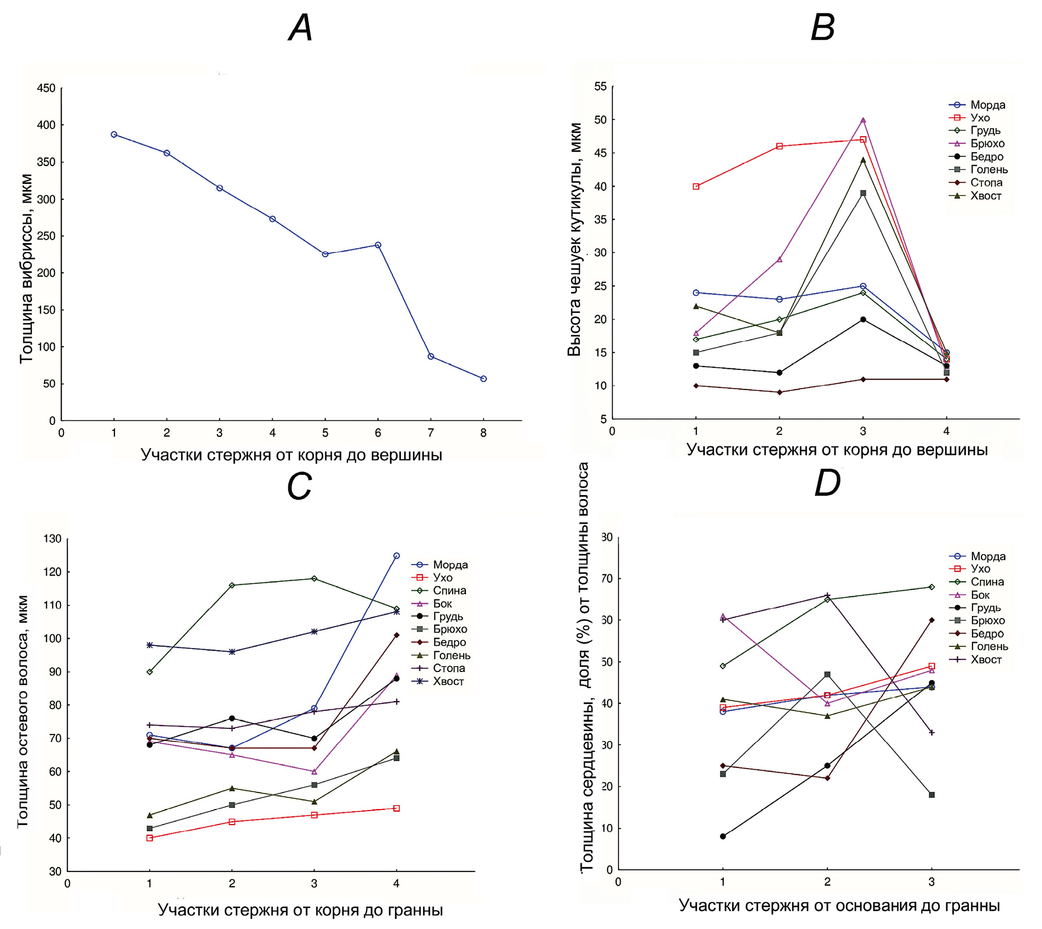 Профиль и толщина вибриссы и остевых волос. Вибрисса жесткая, ярко-рыжего цвета (вероятно, окрашена наполнителем), сильно деформирована, но в неповрежденных участках имеет правильный цилиндрический изогнутый стержень (рис. 3A). “Арочная длина” (изогнутого стержня) вибриссы достигает 60 мм. Толщина вибриссы изменяется по стержню и максимальна в его нижней трети (до 386.7 мкм в прикорневой зоне) (табл. 1, рис. 4A, участки стержня 1–3). Стержень утолщен выше основания тонкой арочной части (рис. 4A, участок 6).