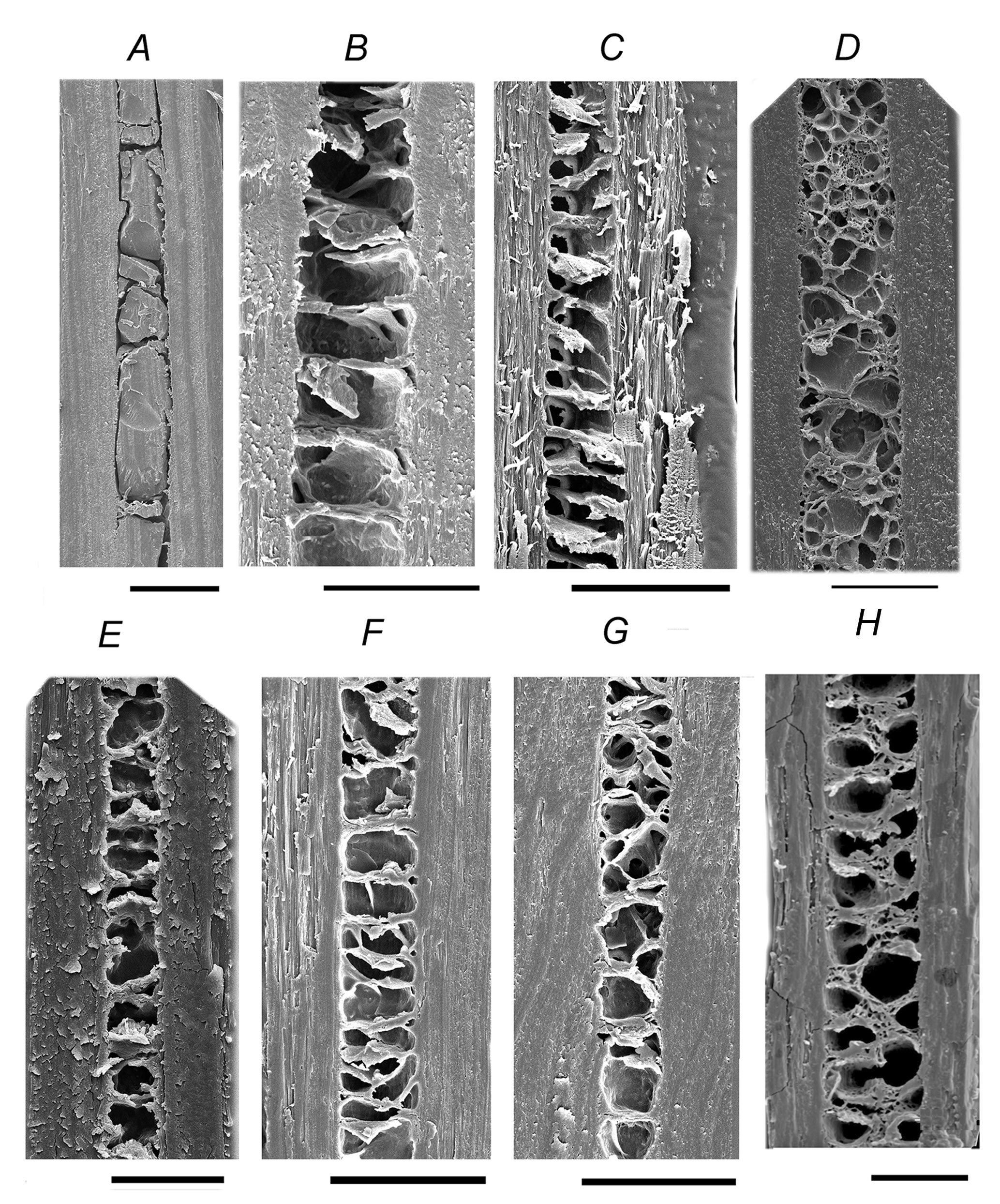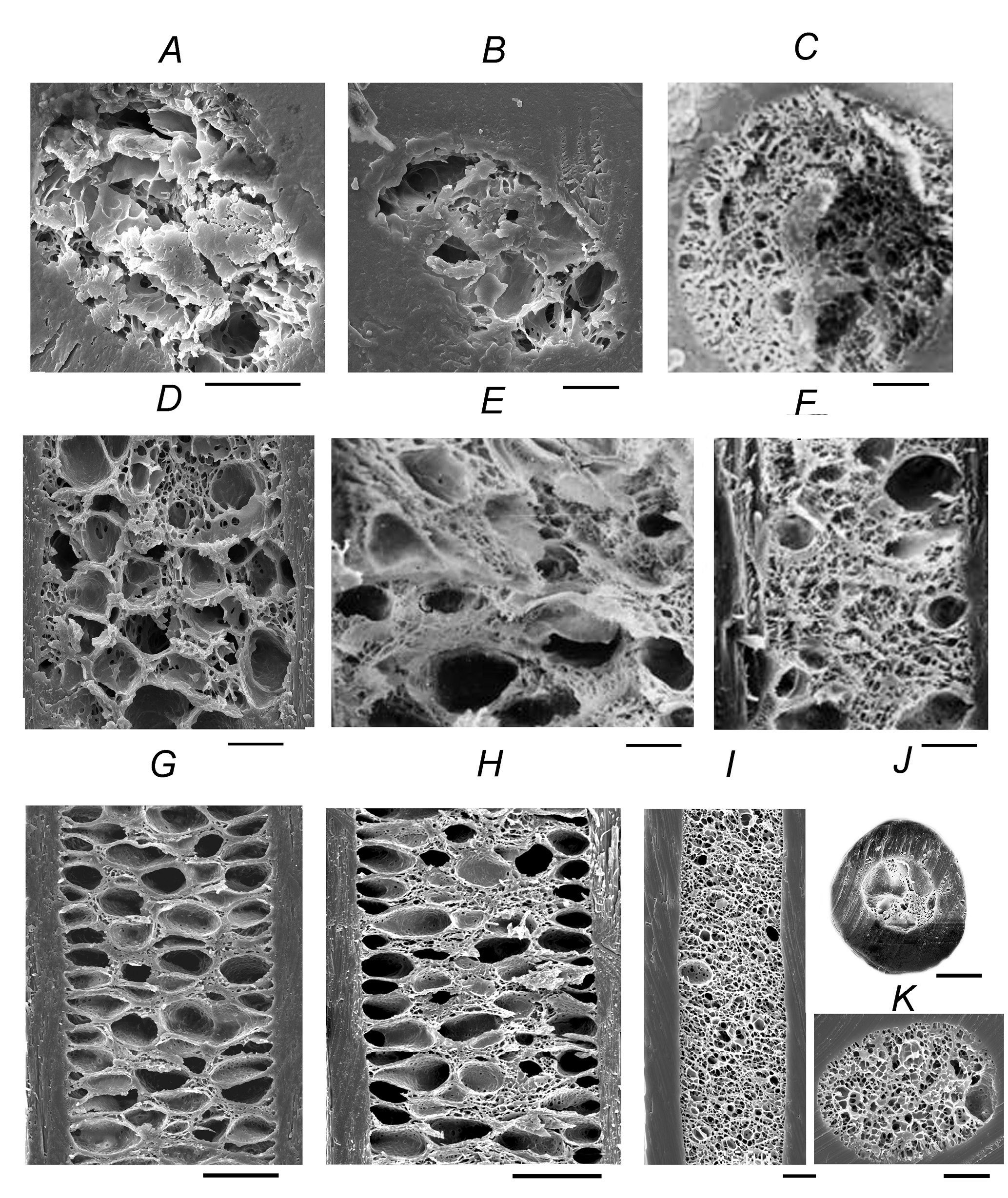 Рис. 7. Микроструктура сердцевины волос взрослых особей плейстоценового волка (Canis lupus ssp.) (A, B, D) из Якутии, серого волка (C. l. lupus) (C, E) из Монголии, домашней собаки (C. familiaris): неаполитанский мастиф (F); обыкновенной лисицы (Vulpes vulpes) (G), песца (Alopex lagopus) (H), голоценового полярного волка (C. lupus tundrarum) (I, J, K) с Чукотки. A–C, J, K – поперечные сечения стержня; D–I – продольные сечения стержня. Данные СЭМ. Масштаб 10 мкм.