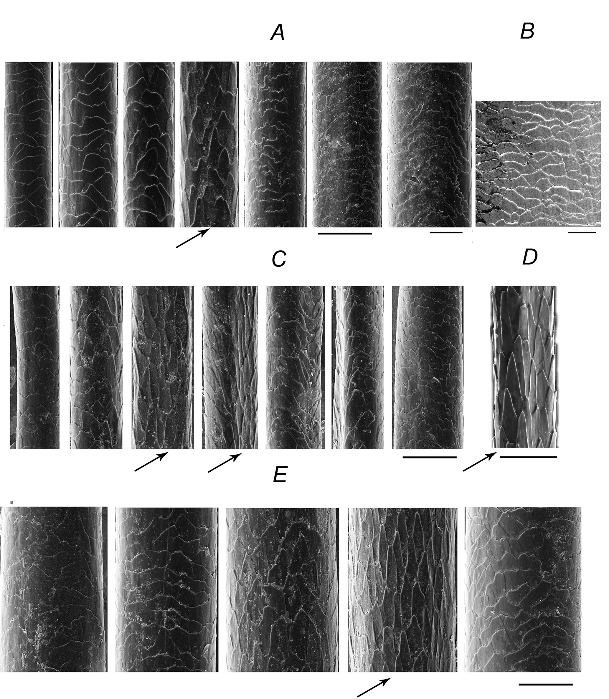 Для морфологического описания волос применяли общепринятую терминологию (Церевитинов, 1951; Соколов, 1973; Соколов и др., 1988, рис. 83; Чернова, Целикова, 2004). Отмечена полиморфность (“дифференцировка”) волосяного покрова (категории и размерные порядки волос). Термин “архитектура волос” обозначает трехмерную структуру наружных и внутренних элементов волоса, полученных на объемных электронных изображениях в СЭМ. “Кольцевидная кутикула” отличается тем, что одна длинная чешуйка полностью оборачивает стержень, чешуйка “лентовидной кутикулы” лежит поперек стержня в виде сплошной узкой ленты, а видоизмененная “ланцетовидная”, “копьевидная” и “шевронная” кутикула состоит из высоких чешуек, вытянутых под разным углом (30°–90°) к поперечной оси стержня (Moore et al., 1974, fig. 9; Соколов и др., 1988, рис. 97а; Teerink, 1991). Сердцевина волос относится к типам “губчатая”, “ячеистая” (“multicellular”, laticce”, англ.) (Moore et al., 1974; Волк, 1985, с. 107; Teerink, 1991; Чернова, Целикова, 2004, с. 44; Tóth, 2017). Мы различаем неупорядоченную губчатую, ажурную или ячеистую сердцевину, в которой микроструктуры сердцевины располагаются хаотично, а также упорядоченную ячеистую сердцевину, в которой крупные воздушные полости располагаются в определенном порядке. В однорядной лестничной сердцевине перегородки лежат однорядно поперек длинной оси стержня.