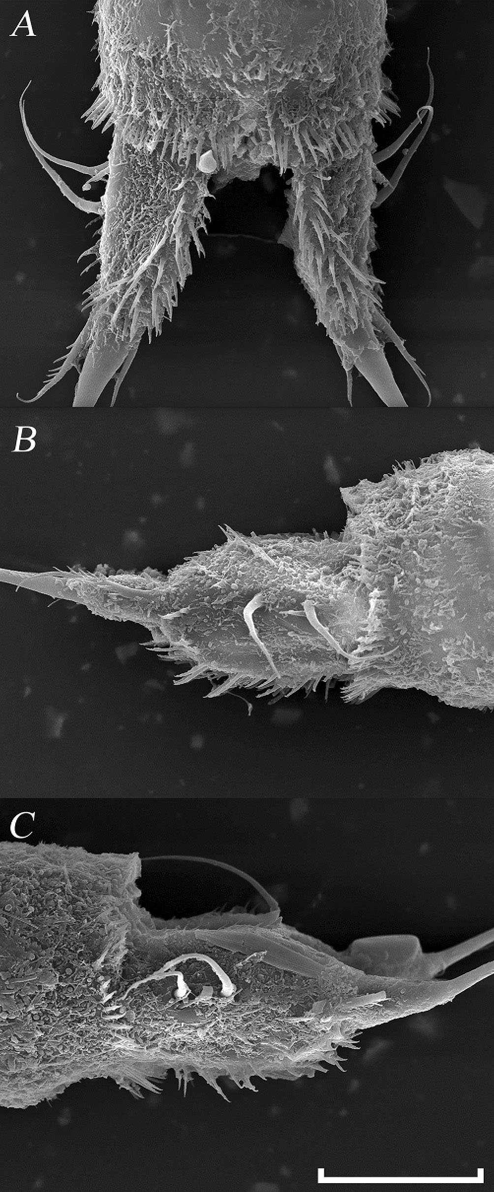Рис. 4. Moraria (Baikalomoraria) okunevae sp. n., СЭМ-фотографии каудальных ветвей самок: A – вентрально; B, C – латерально. Масштаб 50 мкм.