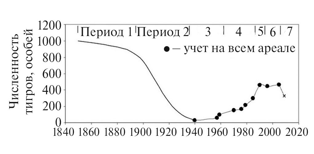 Восстановление популяции тигра в России потребовало значительных усилий со стороны государства в течение длительного периода времени (Стратегия…, 2010). Важной мерой следует считать введение официального запрета на его отстрел в 1947 г. Однако отлов тигрят для зоопарков и цирков велся без ограничений вплоть до конца 1960-х гг. По различным оценкам, ежегодно из природы изымалось от 10 до 15 тигрят. В процессе их отлова часто гибли взрослые самки (Абрамов, 1958; Кучеренко, 1985, 2001; Костоглод, 1983). В 1960–1970-е гг. браконьерами было убито не менее 138 тигров, 42 особи отловлены по специальным разрешениям. В среднем ежегодно погибало или безвозвратно изымалось более 20% популяции (Абрамов, 1974). В неблагоприятные для копытных 1982–1984 гг. резко сократилась численность кабана (Sus scrofa), вследствие чего только по официальным данным в Приморском крае с ноября 1984 г. по апрель 1985 г. погибло 9 взрослых тигров и 8 тигрят (Николаев, 1985). Аналогичная ситуация сложилась и на юге Хабаровского края после падежа кабанов из-за эпизоотии классической чумы свиней, где за одну зиму 1983/1984 гг. только в Вяземском районе официально было отстреляно 8 тигров, проявлявших конфликтное поведение по отношению к человеку (А. Д. Степных, личное сообщение). В 1986 г. популяция кабана находилась в глубокой депрессии, а поголовье изюбря (Cervus canadensis), пятнистого оленя (Cervus nippon) и косули (Capreolus pygargus) оказалось ниже экологически оптимальной их численности. В сложившейся ситуации значительная часть тигров в популяции была вынуждена искать пропитание в населенных пунктах, что привело к отстрелу 32 особей (Гапонов, 2009).
