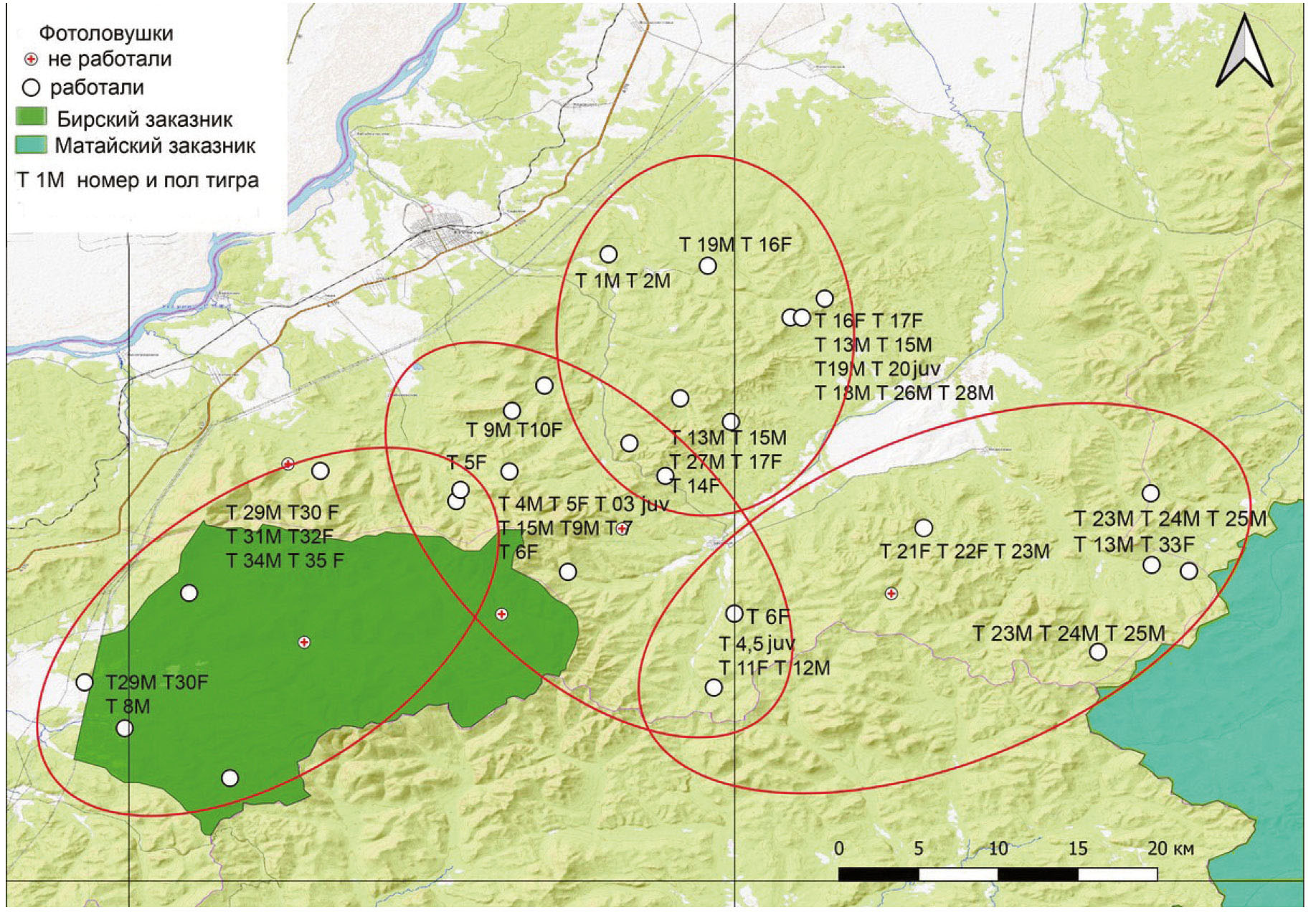 Рис. 3. Схема размещения фотоловушек и пространственное распределение репродуктивных групп тигра на Вяземском участке. Эллипсами обозначены гипотетические границы репродуктивных ядер. Указаны номер и пол (F – самка, M – самец) тигров, зарегистрированных фотоловушками.